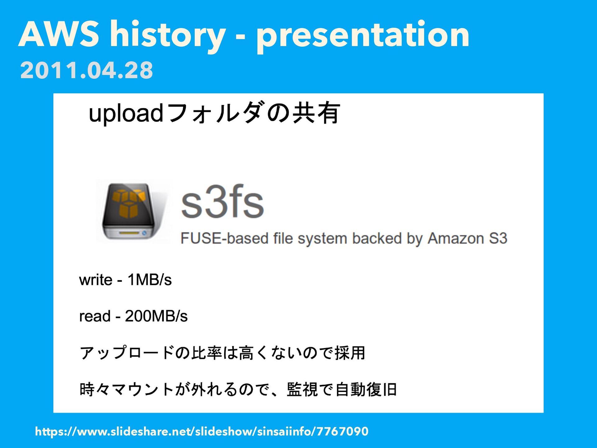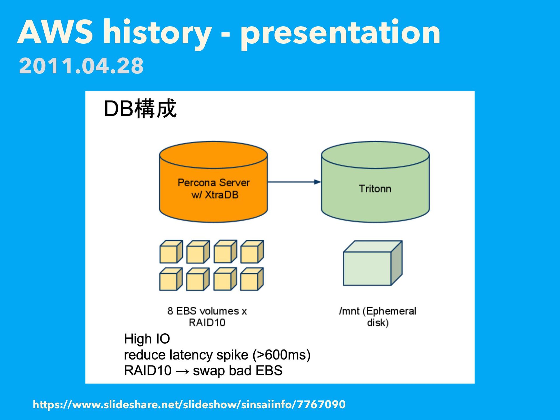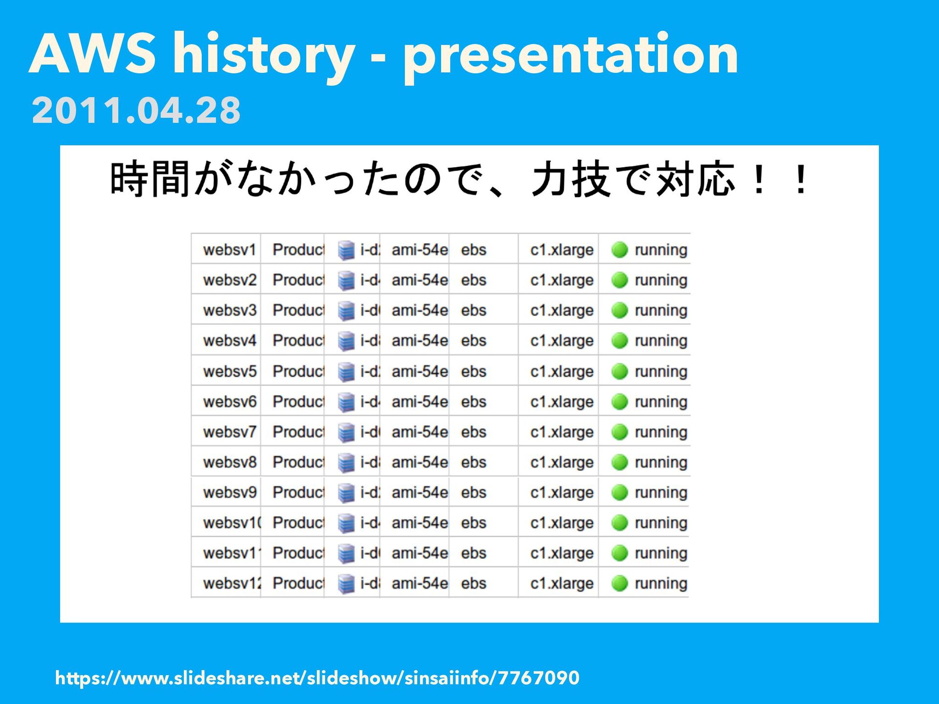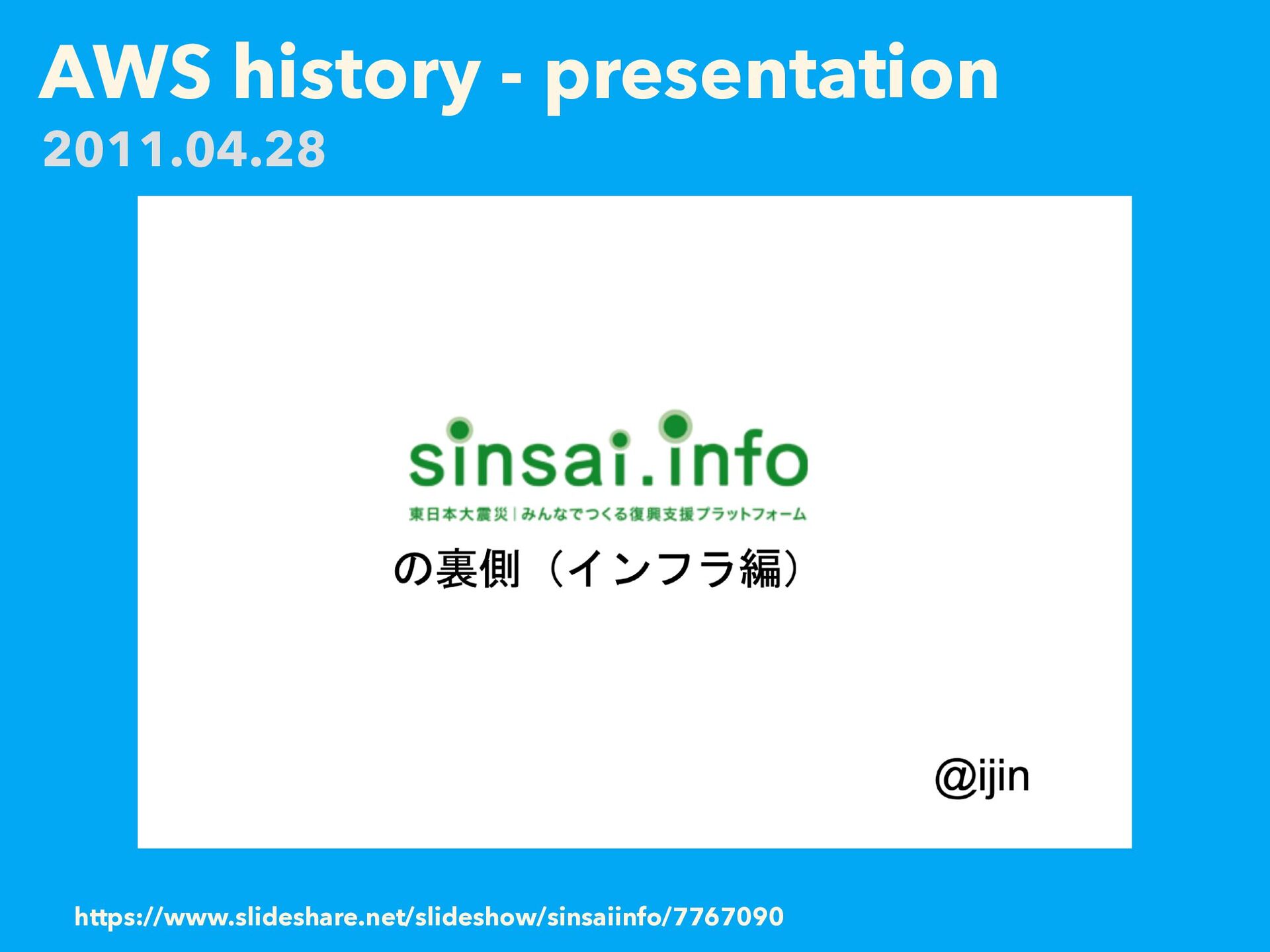 AWS history - presentation https://web.archive.org/web/20110419014336/http://atnd.org/events/14941 2011.04.28