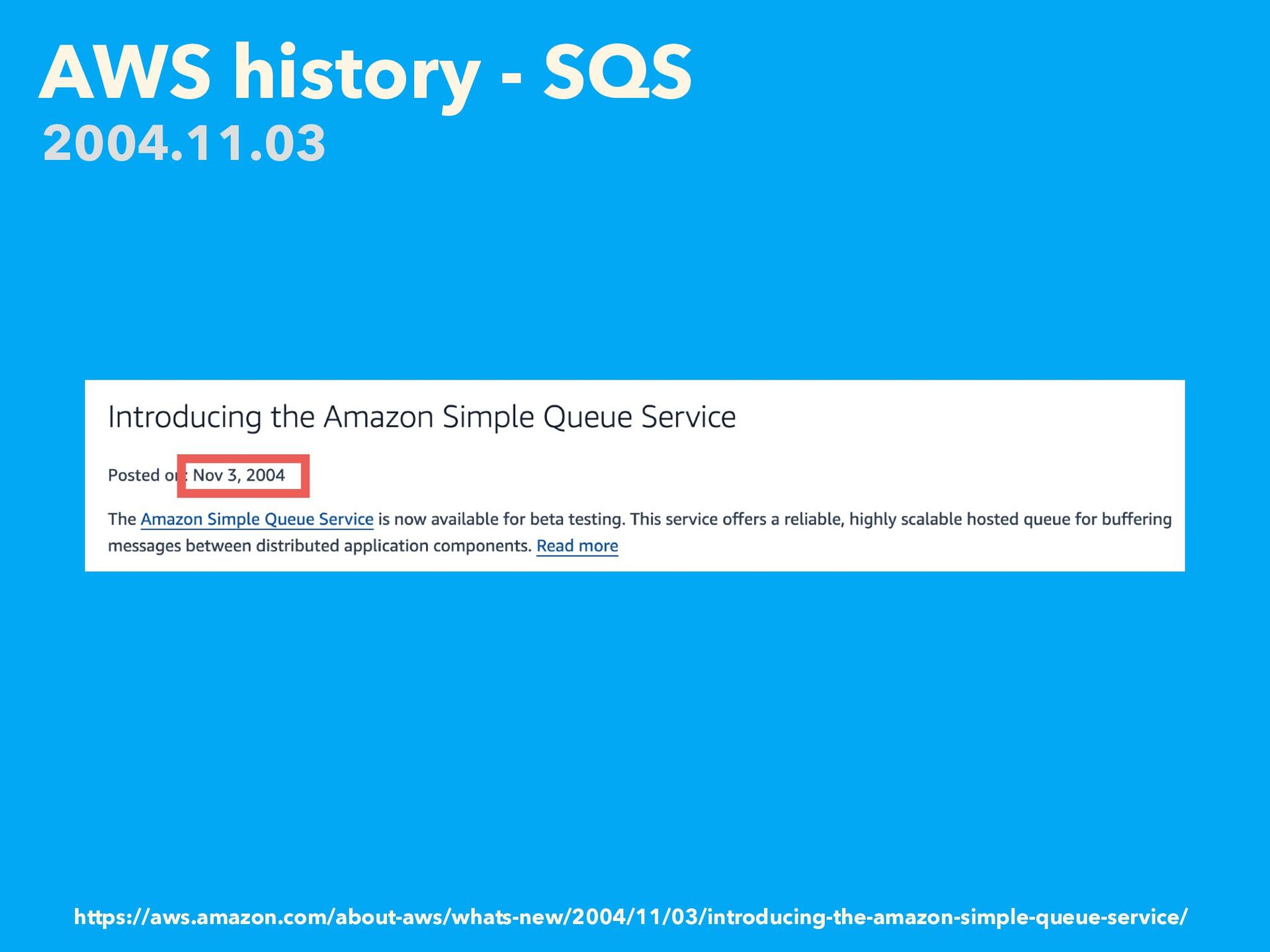 AWS history - SQS https://aws.amazon.com/about-aws/whats-new/2004/11/03/introducing-the-amazon-simple-queue-service/ 2004.11.03