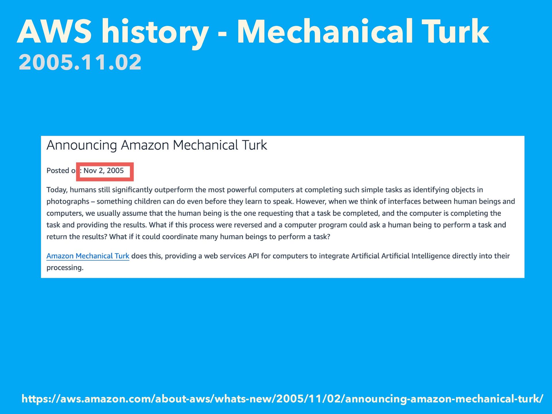 AWS history - Mechanical Turk https://aws.amazon.com/about-aws/whats-new/2005/11/02/announcing-amazon-mechanical-turk/ 2005.11.02