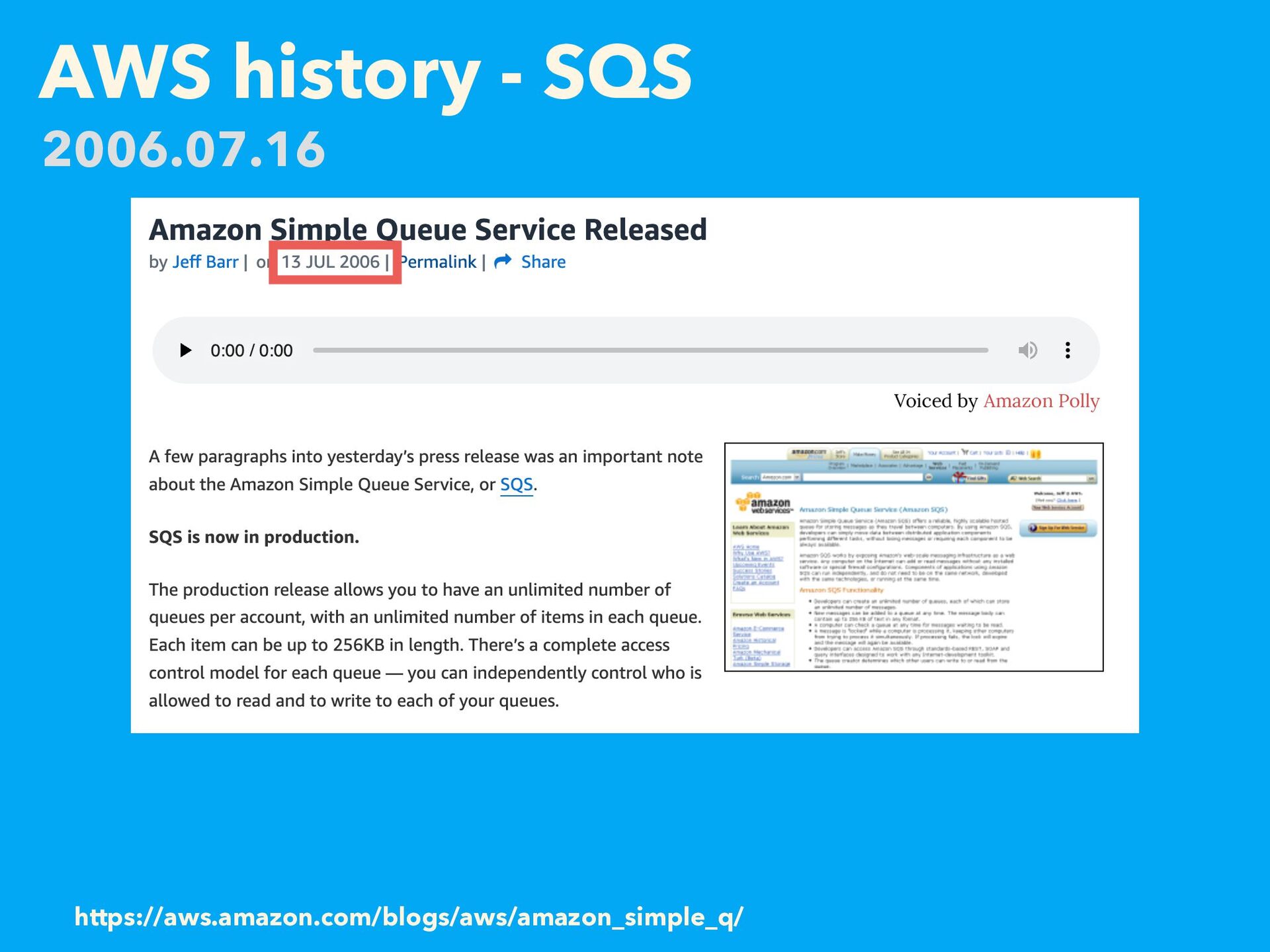 AWS history - SQS https://aws.amazon.com/blogs/aws/amazon_simple_q/ 2006.07.16