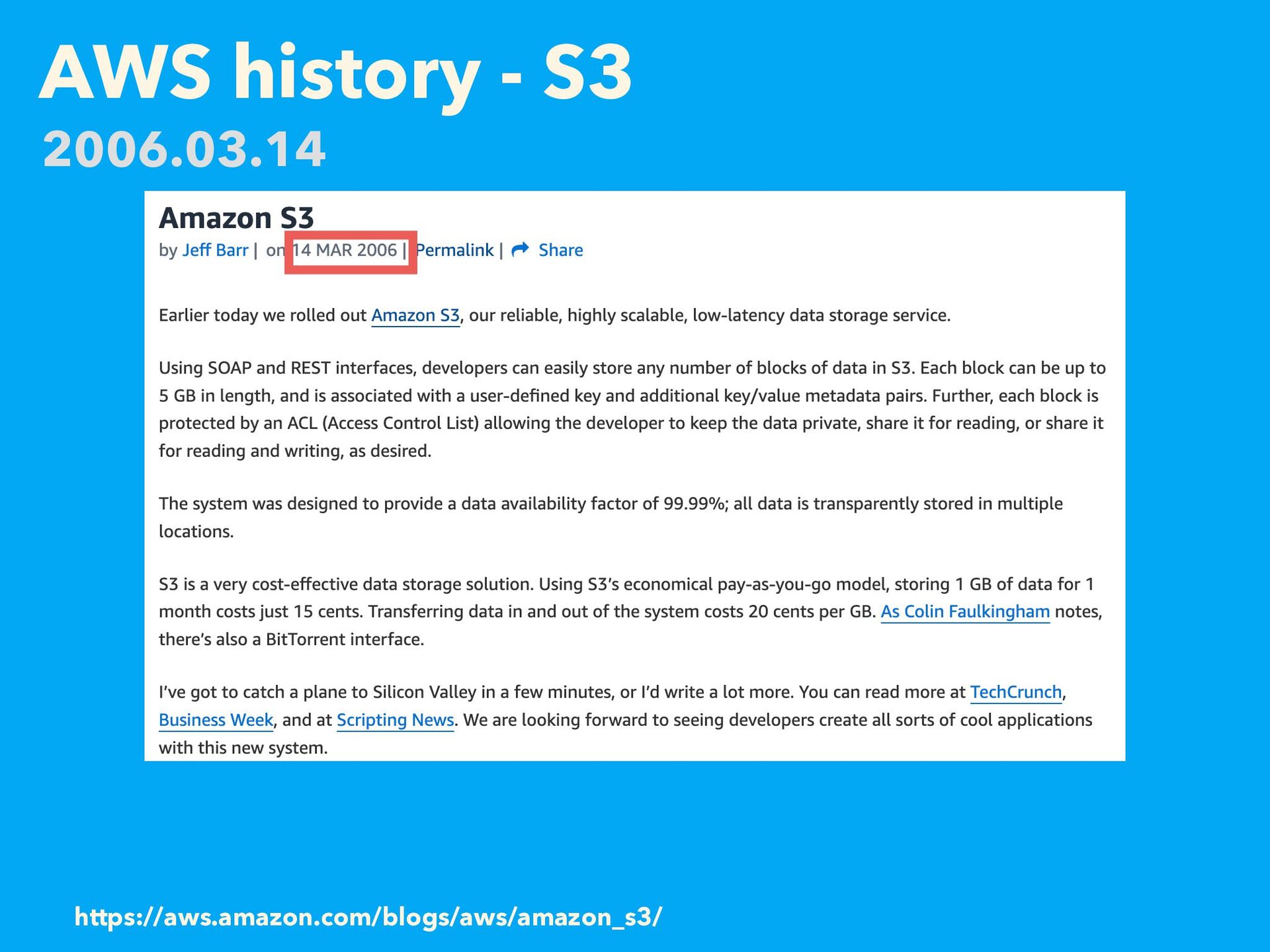 AWS history - S3 https://aws.amazon.com/blogs/aws/amazon_s3/ 2006.03.14
