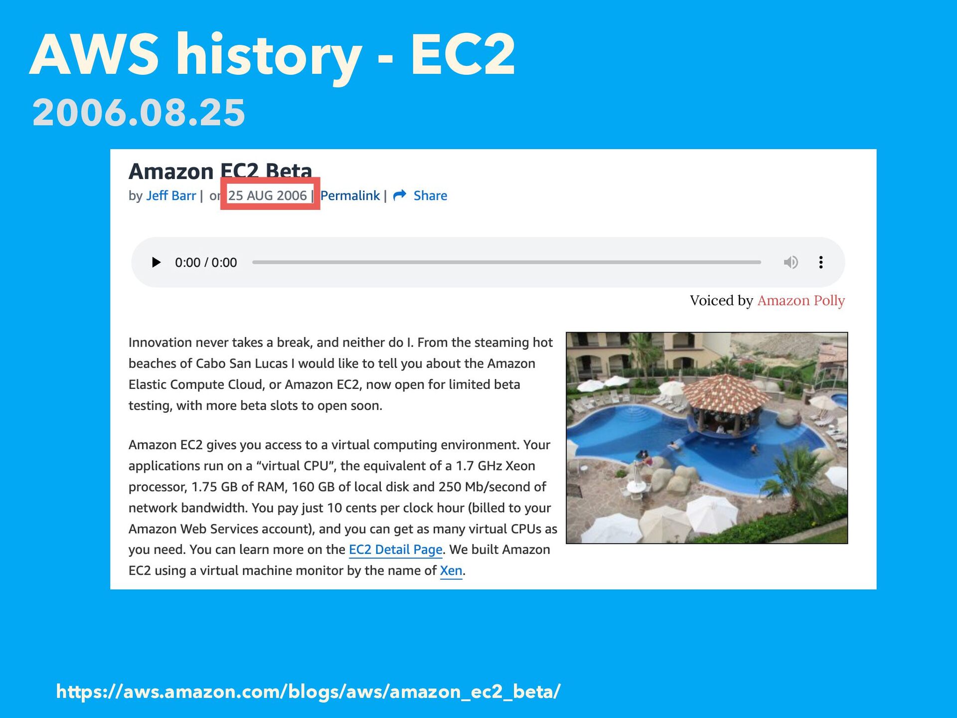AWS history - EC2 https://aws.amazon.com/blogs/aws/amazon_ec2_beta/ 2006.08.25