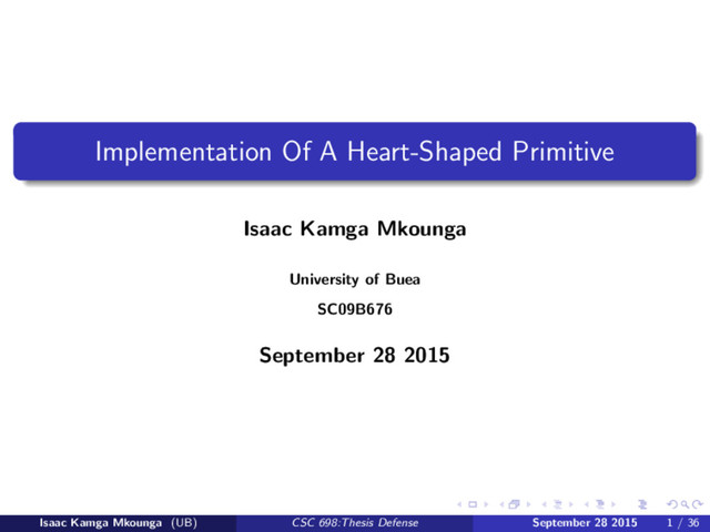 millions of light rays towards the heart-shape’s surface and coloring the intersection points.Four functions were written viz rt hrt prep(),rt hrt norm(), rt hrt shot() and rt hrt print() functions. rt hrt prep() prepares the heart-shape for raytracing by making sure that all of its parameters are within appropriate limits. rt hrt print() prints the position vector of the heart-shapes center and the two (2) matrices for transposing, rotating and scaling just to make sure that are correct. rt hrt shot() finds the intersection points of the light rays and the heart-shape’s surface. rt hrt norm() computes the normal to the heart-shape’s surface at the intersection point. Isaac Kamga Mkounga (UB) CSC 698:Thesis Defense September 28 2015 22 / 36