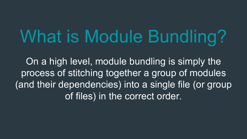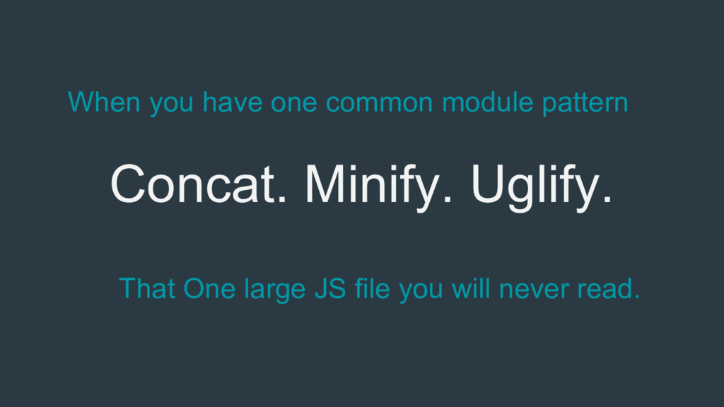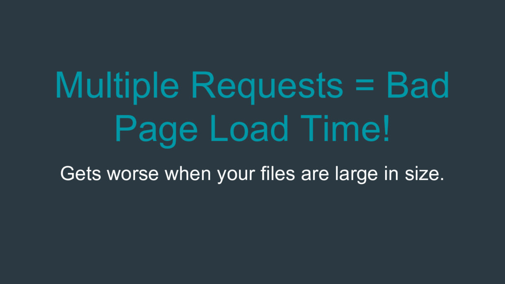 the same scope. - Easy for an HTML file to have 100+ script tags loading as many files in it. - Manually handle dependencies by reordering the sequence of loading. - Every Script tag is a trip to the resource for that script file.