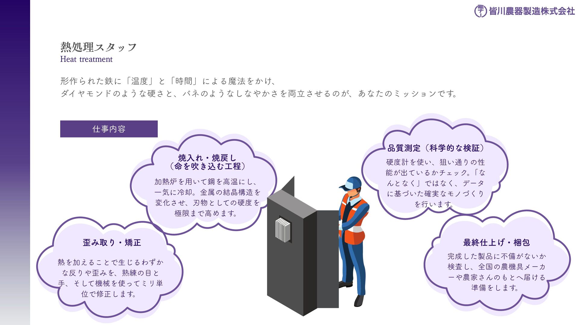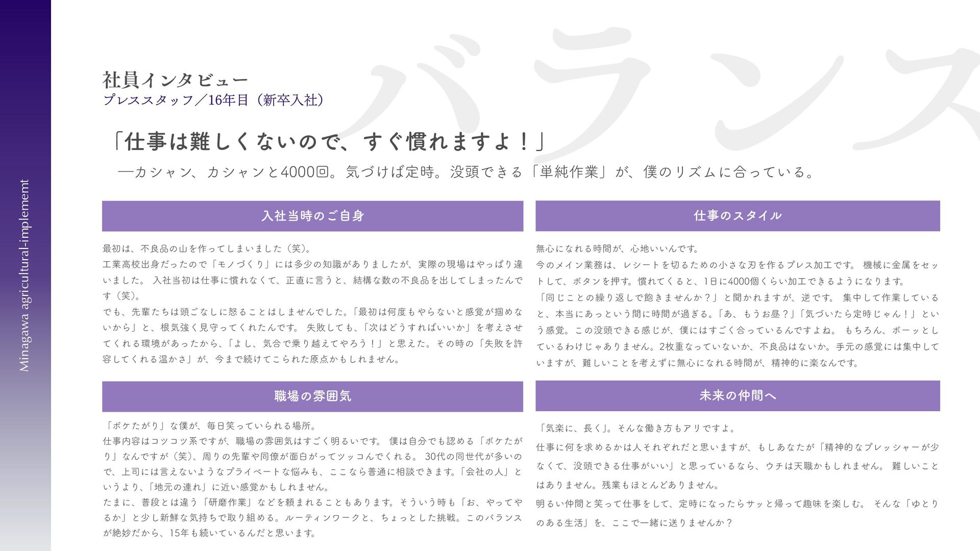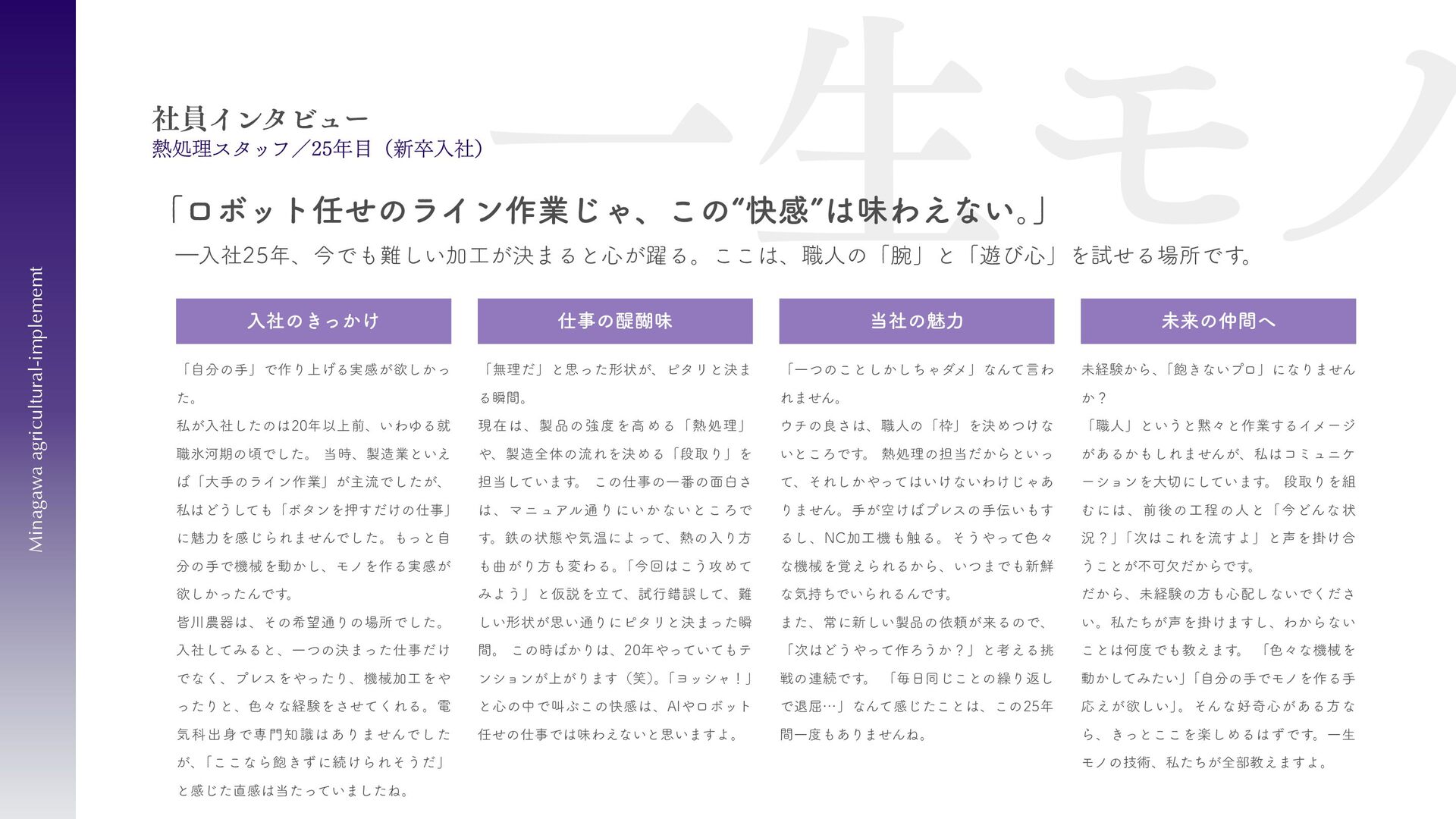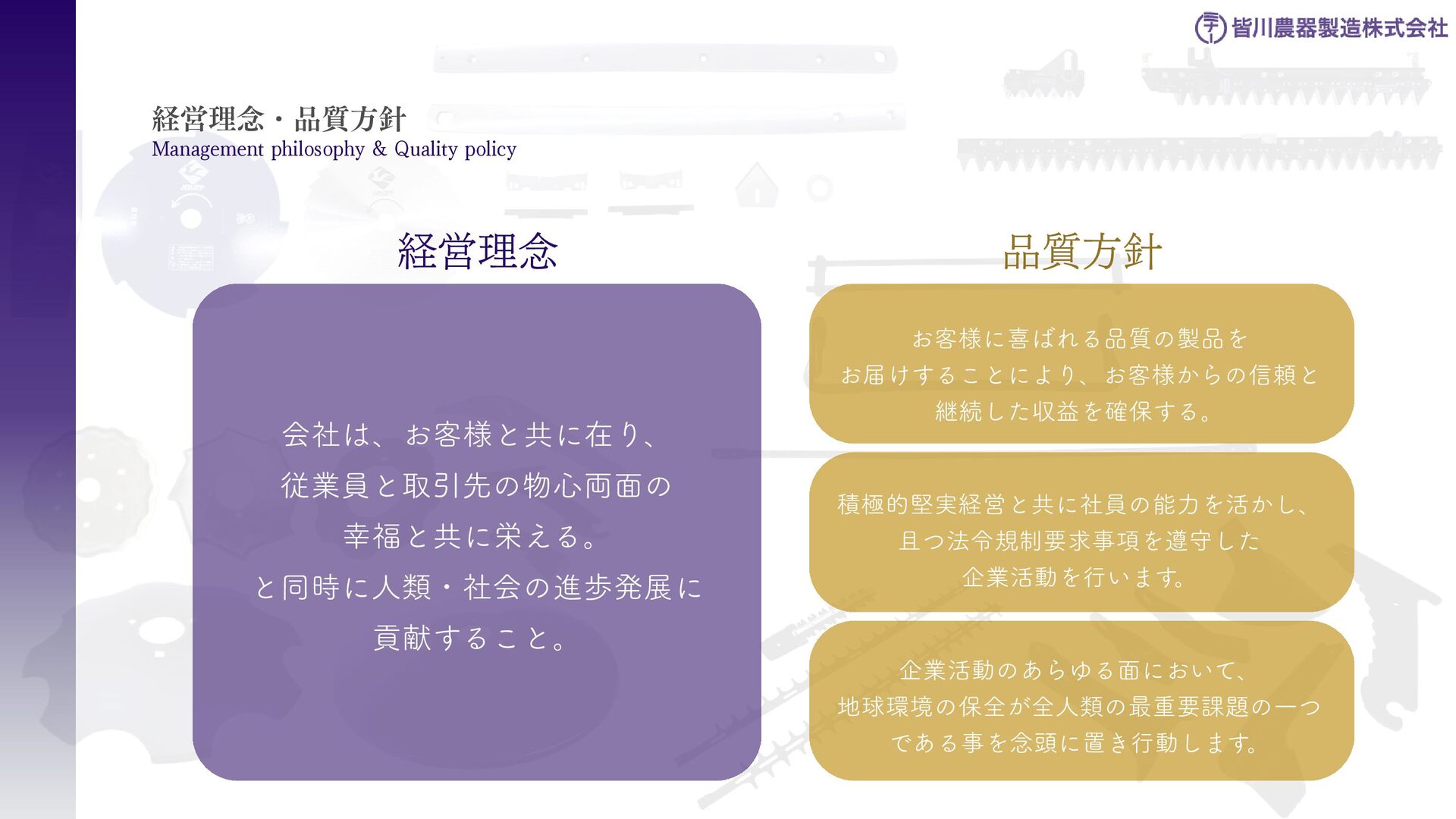 刈払機用は、鋼板の物 と、鋼板の先端に超硬チ ップを付けたチップソー があります 。バーナイフ、 ハンマーナイフは、専用 機械に取り付けて使いま す 。 草刈用 当社の刃物はヨーロッパのベルサイユ宮殿の庭管理にも使われています。 草刈から産業用までさまざまなシーンで使われる刃物の製造・販売をしています。 シーンによりニーズは異なり、切れ味が良ければそれでいいというわけではなかったり奥深い世界です。 稲作用 米や小麦の収穫用コンバ イン・バインダーに使用 される刃物です。コンバ インやバインダーの先端 に取り付けて稲の刈取を する刈取刃。 コンバインの中に組入れ て脱穀するワラ切刃、稲 わらを裁断するストロー カッター。野菜等のカッ ターとしても使用されて います 。 畑作用 田畑の土を耕起する、野 菜を収穫する、根や葉を 切断するために使用され る刃物です 。 円盤状になっていて田畑 の土を起こす機能のディ スク・コルター。 トウモロコシ、ジャガイ モ、ビート、牧草等の野 菜を収穫する時に使用さ れるカッター、ナイフ。 園芸・芝刈用 生け垣などの剪定や公 園・ゴルフ場等の芝草を 管理する刃物です。生け 垣の剪定、刈込みに使用 されるヘッジトリマー 刃。公共の場はもちろ ん、家庭の樹木の剪定に も最適な刃物です 。 ゴルフ場や公園で主に使 われる芝刈機用の回転 刃、固定刃。 産業用 用紙を切断する刃物や、 林業用機械、建設現場の 機械で使用される刃物で す 。 名刺やレシート、普通紙 等の紙を切断する刃物。 木材を粉砕する刃物、コ ンクリートや地面をきれ いにする刃物。 その他にもあります。ご 相談ください。 コンベア 収穫した作物の搬送や肥 料撒きで使用される搬送 コンベア部品。 ジャガイモ、タマネギ等 の野菜を収穫するときに 使用されるコンベア部 品。肥料を田畑に撒くと きに使用される搬送用コ ンベア部品。鍛造溶接 品、ロット丸棒仕様と多 種に対応可能です 。 特殊鋼 特殊鋼板の熱間加工、特 殊丸鋼の曲げ加工品で す 。 ひょうたん形状、ねじれ 形状、変形曲げなど必要 に応じた刃物・部品の形 状に対応が可能です 。 ご相談ください。