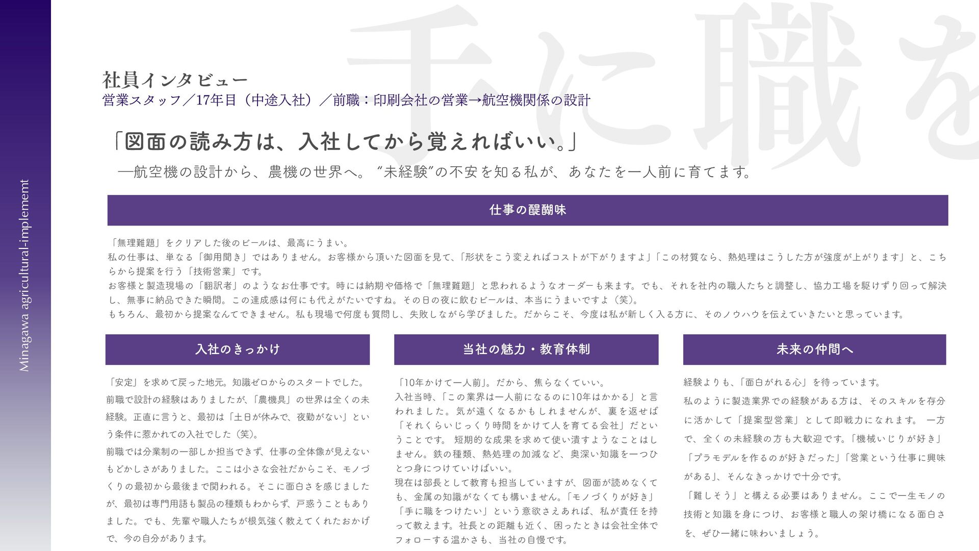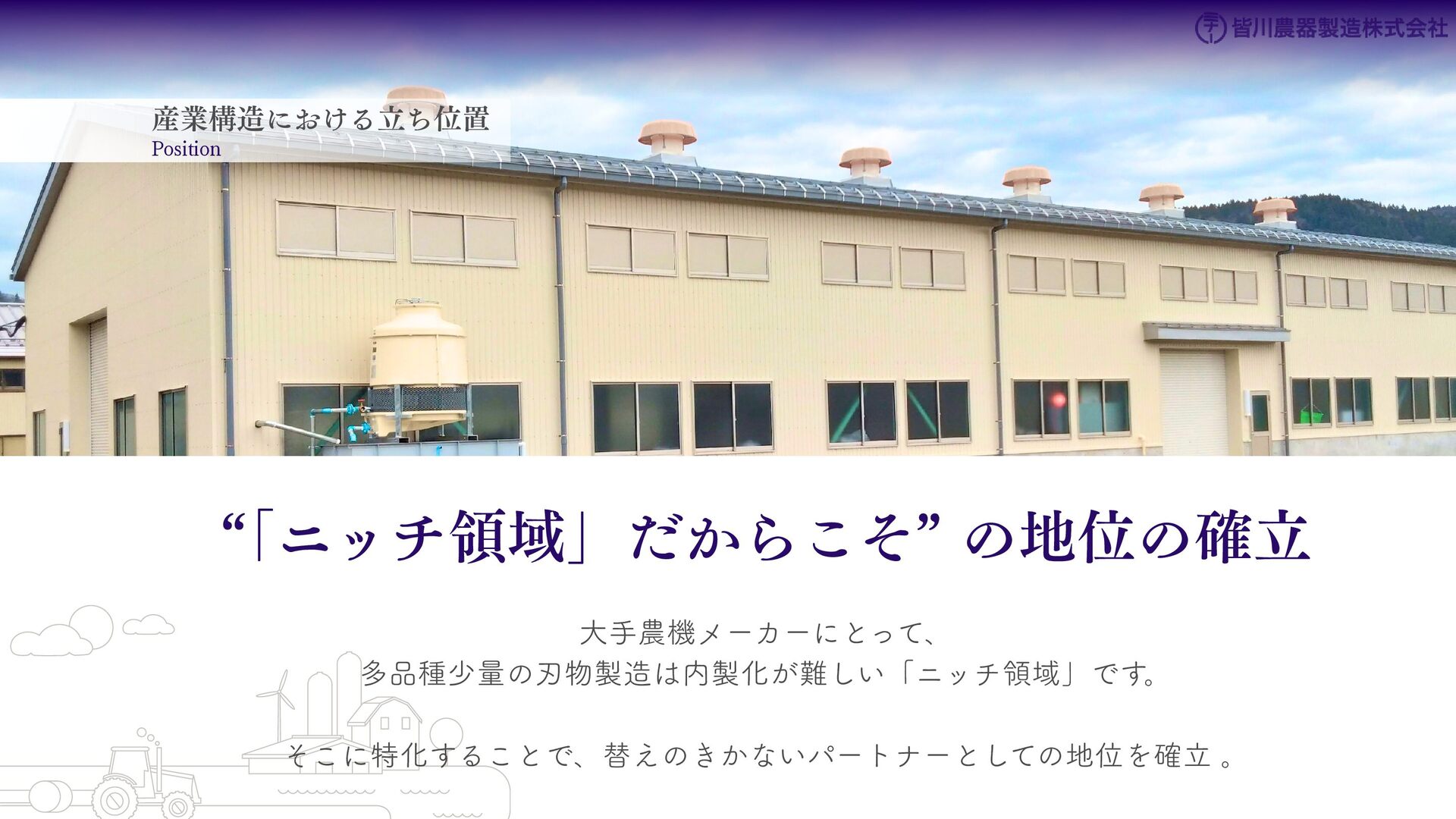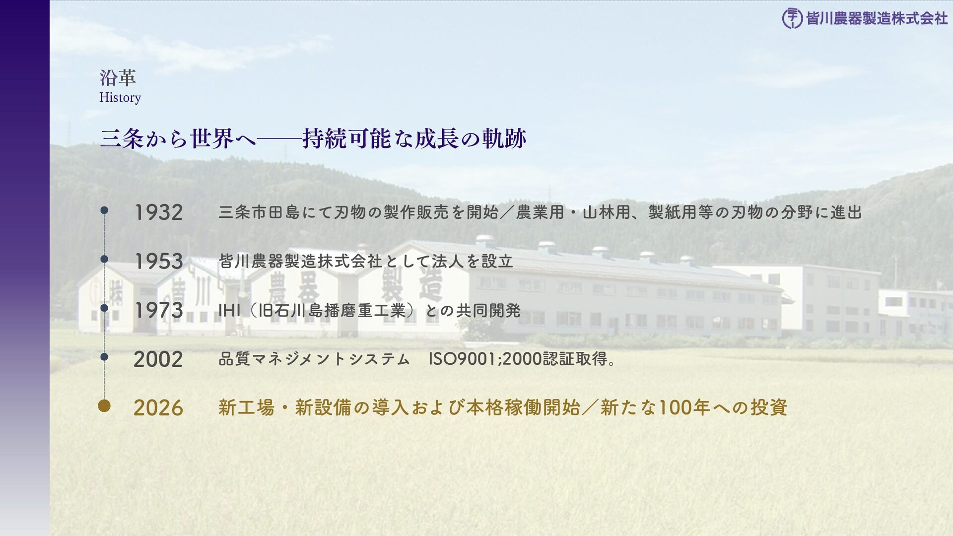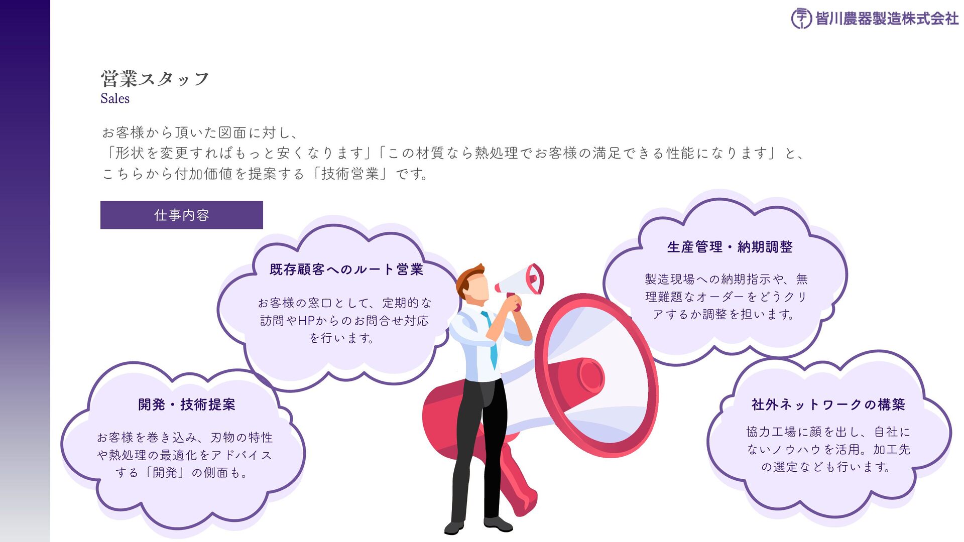 刈払機用は、鋼板の物 と、鋼板の先端に超硬チ ップを付けたチップソー があります 。バーナイフ、 ハンマーナイフは、専用 機械に取り付けて使いま す 。 草刈用 当社の刃物はヨーロッパのベルサイユ宮殿の庭管理にも使われています。 草刈から産業用までさまざまなシーンで使われる刃物の製造・販売をしています。 シーンによりニーズは異なり、切れ味が良ければそれでいいというわけではなかったり奥深い世界です。 稲作用 米や小麦の収穫用コンバ イン・バインダーに使用 される刃物です。コンバ インやバインダーの先端 に取り付けて稲の刈取を する刈取刃。 コンバインの中に組入れ て脱穀するワラ切刃、稲 わらを裁断するストロー カッター。野菜等のカッ ターとしても使用されて います 。 畑作用 田畑の土を耕起する、野 菜を収穫する、根や葉を 切断するために使用され る刃物です 。 円盤状になっていて田畑 の土を起こす機能のディ スク・コルター。 トウモロコシ、ジャガイ モ、ビート、牧草等の野 菜を収穫する時に使用さ れるカッター、ナイフ。 園芸・芝刈用 生け垣などの剪定や公 園・ゴルフ場等の芝草を 管理する刃物です。生け 垣の剪定、刈込みに使用 されるヘッジトリマー 刃。公共の場はもちろ ん、家庭の樹木の剪定に も最適な刃物です 。 ゴルフ場や公園で主に使 われる芝刈機用の回転 刃、固定刃。 産業用 用紙を切断する刃物や、 林業用機械、建設現場の 機械で使用される刃物で す 。 名刺やレシート、普通紙 等の紙を切断する刃物。 木材を粉砕する刃物、コ ンクリートや地面をきれ いにする刃物。 その他にもあります。ご 相談ください。 コンベア 収穫した作物の搬送や肥 料撒きで使用される搬送 コンベア部品。 ジャガイモ、タマネギ等 の野菜を収穫するときに 使用されるコンベア部 品。肥料を田畑に撒くと きに使用される搬送用コ ンベア部品。鍛造溶接 品、ロット丸棒仕様と多 種に対応可能です 。 特殊鋼 特殊鋼板の熱間加工、特 殊丸鋼の曲げ加工品で す 。 ひょうたん形状、ねじれ 形状、変形曲げなど必要 に応じた刃物・部品の形 状に対応が可能です 。 ご相談ください。