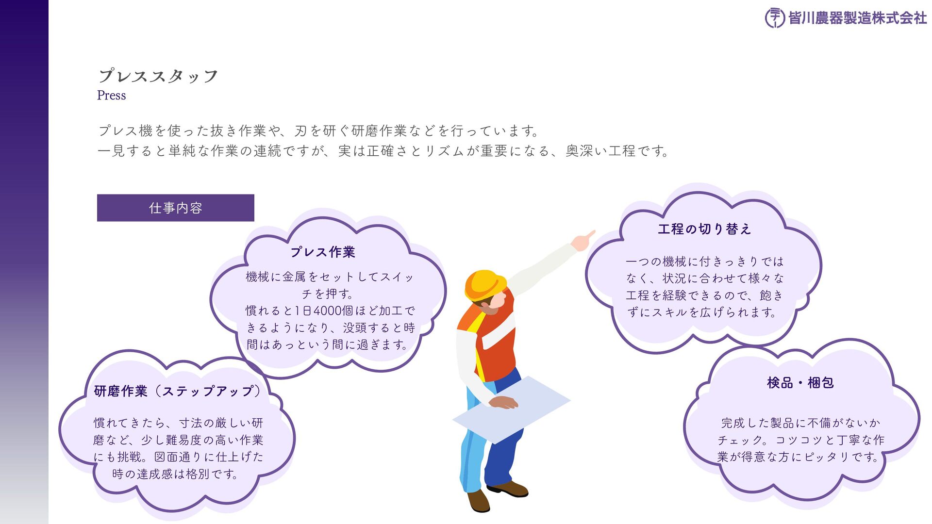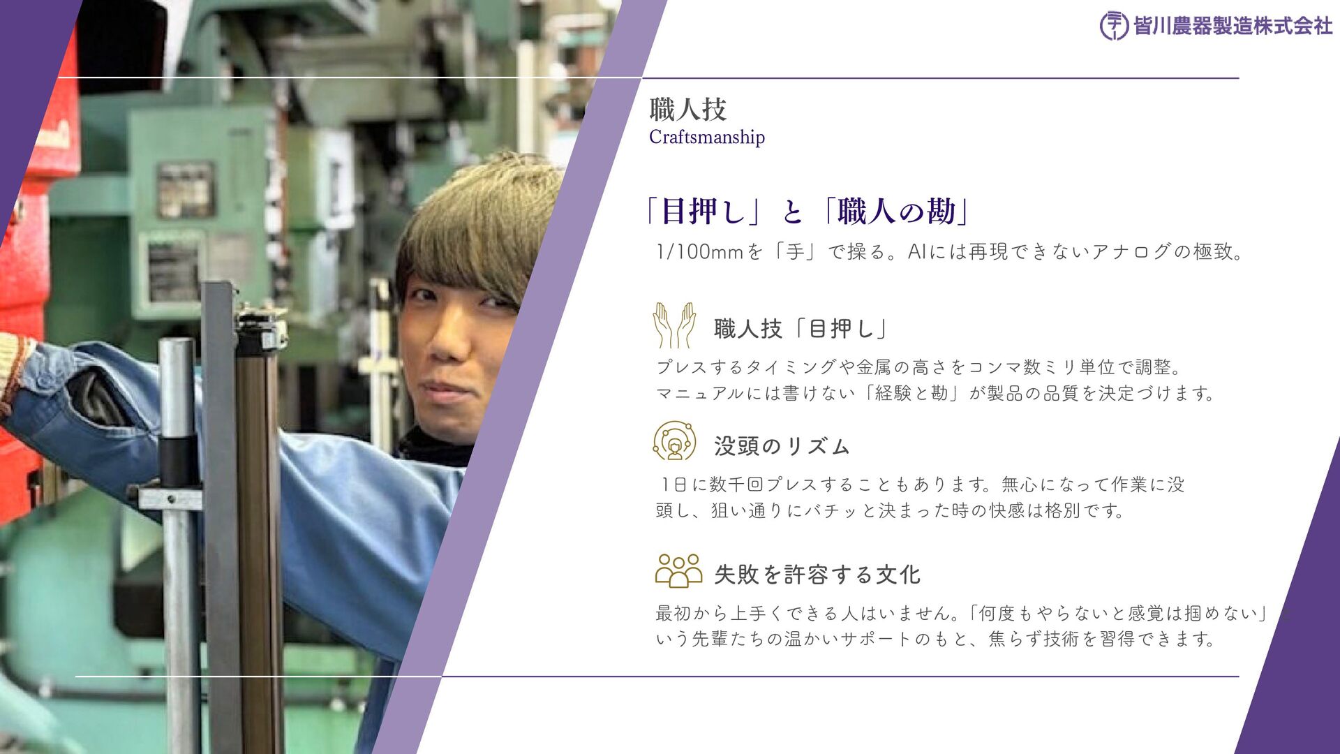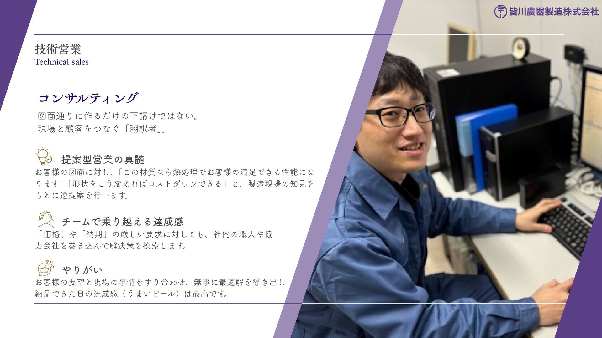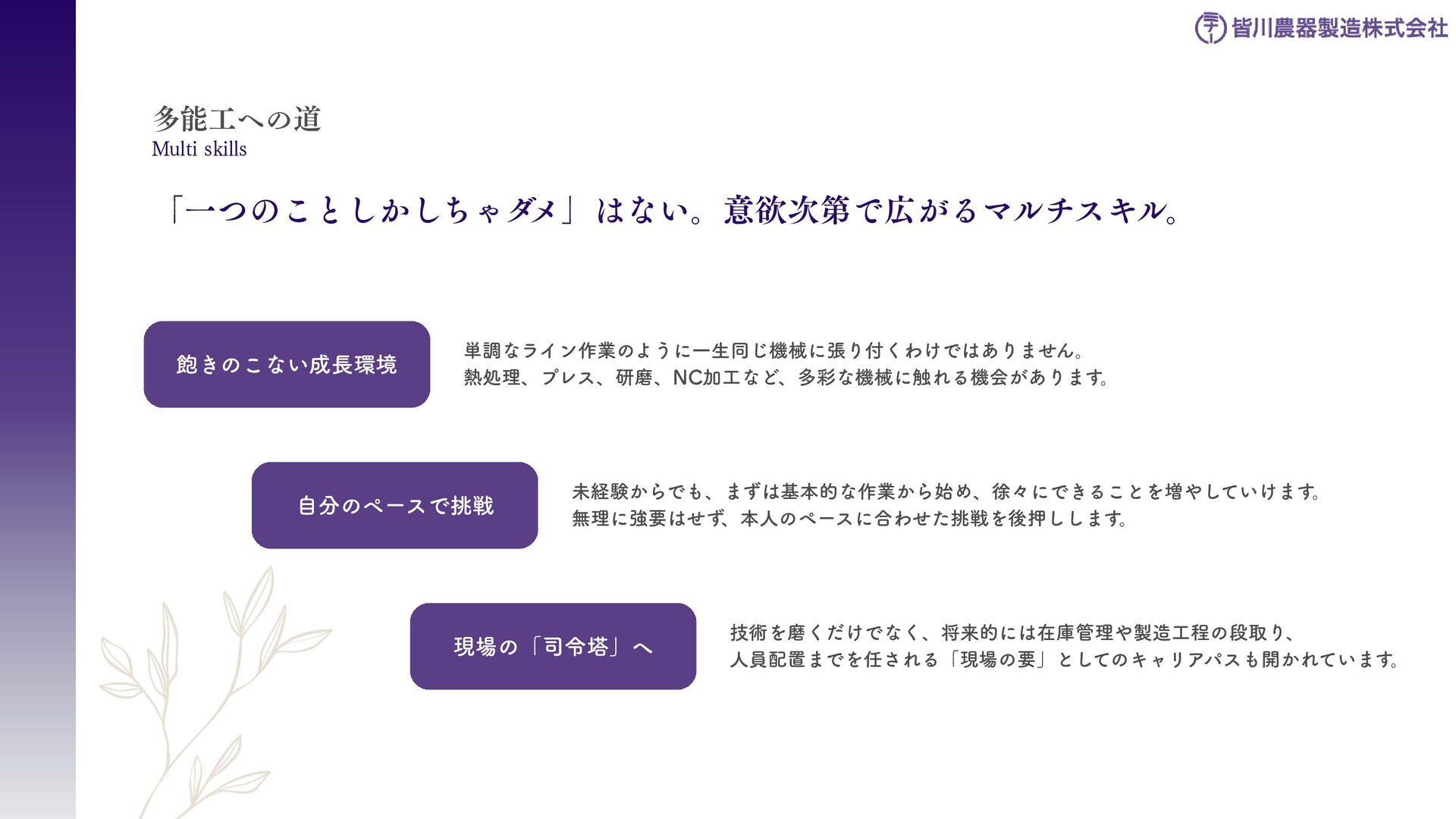 刈払機用は、鋼板の物 と、鋼板の先端に超硬チ ップを付けたチップソー があります 。バーナイフ、 ハンマーナイフは、専用 機械に取り付けて使いま す 。 草刈用 当社の刃物はヨーロッパのベルサイユ宮殿の庭管理にも使われています。 草刈から産業用までさまざまなシーンで使われる刃物の製造・販売をしています。 シーンによりニーズは異なり、切れ味が良ければそれでいいというわけではなかったり奥深い世界です。 稲作用 米や小麦の収穫用コンバ イン・バインダーに使用 される刃物です。コンバ インやバインダーの先端 に取り付けて稲の刈取を する刈取刃。 コンバインの中に組入れ て脱穀するワラ切刃、稲 わらを裁断するストロー カッター。野菜等のカッ ターとしても使用されて います 。 畑作用 田畑の土を耕起する、野 菜を収穫する、根や葉を 切断するために使用され る刃物です 。 円盤状になっていて田畑 の土を起こす機能のディ スク・コルター。 トウモロコシ、ジャガイ モ、ビート、牧草等の野 菜を収穫する時に使用さ れるカッター、ナイフ。 園芸・芝刈用 生け垣などの剪定や公 園・ゴルフ場等の芝草を 管理する刃物です。生け 垣の剪定、刈込みに使用 されるヘッジトリマー 刃。公共の場はもちろ ん、家庭の樹木の剪定に も最適な刃物です 。 ゴルフ場や公園で主に使 われる芝刈機用の回転 刃、固定刃。 産業用 用紙を切断する刃物や、 林業用機械、建設現場の 機械で使用される刃物で す 。 名刺やレシート、普通紙 等の紙を切断する刃物。 木材を粉砕する刃物、コ ンクリートや地面をきれ いにする刃物。 その他にもあります。ご 相談ください。 コンベア 収穫した作物の搬送や肥 料撒きで使用される搬送 コンベア部品。 ジャガイモ、タマネギ等 の野菜を収穫するときに 使用されるコンベア部 品。肥料を田畑に撒くと きに使用される搬送用コ ンベア部品。鍛造溶接 品、ロット丸棒仕様と多 種に対応可能です 。 特殊鋼 特殊鋼板の熱間加工、特 殊丸鋼の曲げ加工品で す 。 ひょうたん形状、ねじれ 形状、変形曲げなど必要 に応じた刃物・部品の形 状に対応が可能です 。 ご相談ください。