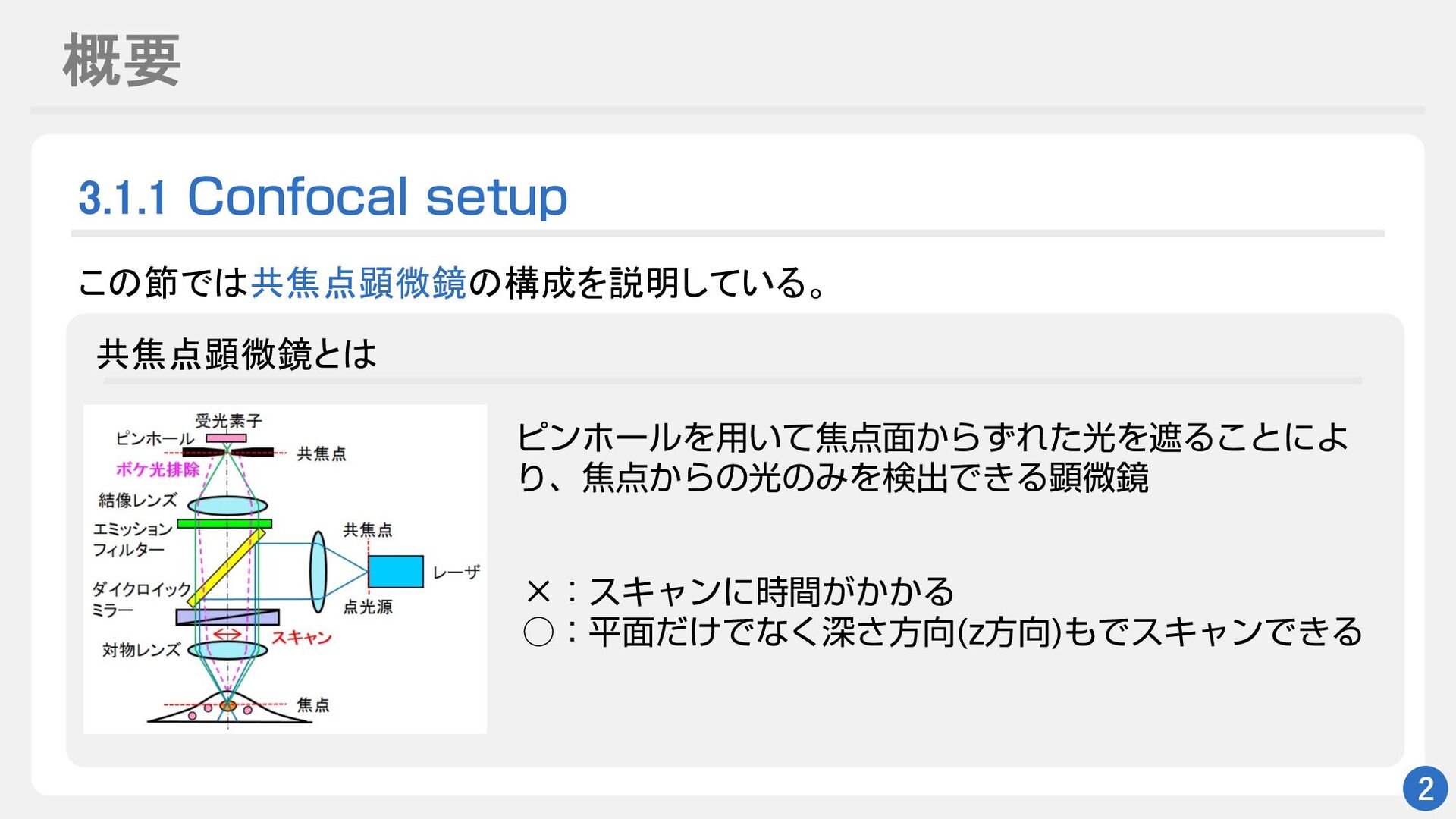 概要 3.1.1 $POGPDBMTFUVQ 2 この節では共焦点顕微鏡の構成を説明している。 共焦点顕微鏡とは ϐϯϗʔϧΛ༻͍ͯয໘͔ΒͣΕͨޫΛःΔ͜ͱʹΑ Γɺয͔ΒͷޫͷΈΛݕग़Ͱ͖Δݦඍڸ ʷɿεΩϟϯʹ͕͔͔࣌ؒΔ ˓ɿฏ໘͚ͩͰͳ͘ਂ͞ํ
