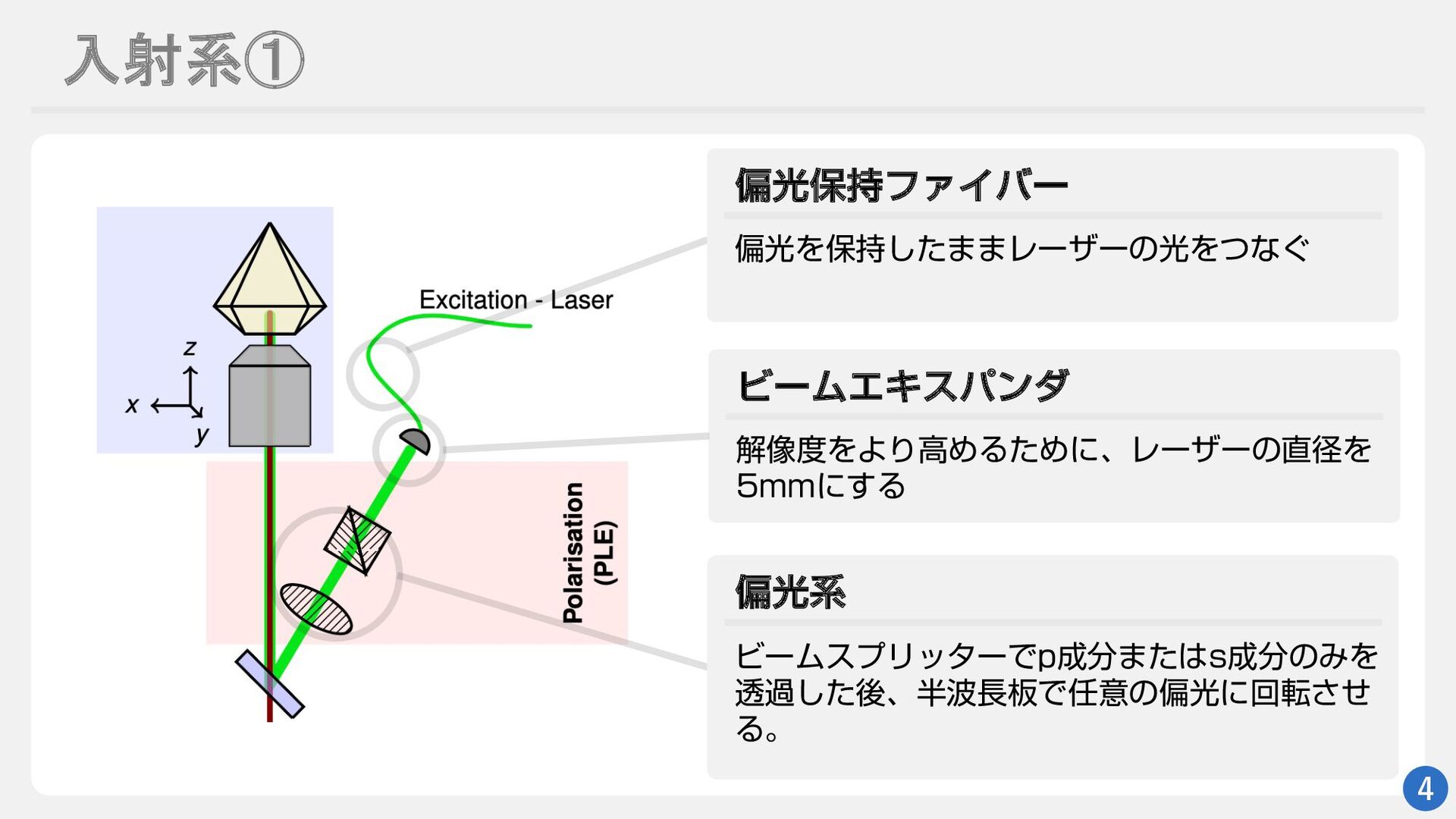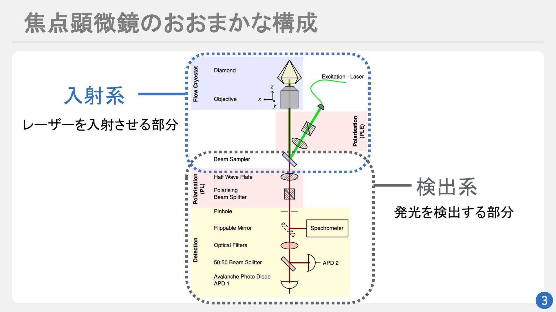 焦点顕微鏡のおおまかな構成 3 検出系 入射系 レーザーを入射させる部分 発光を検出する部分