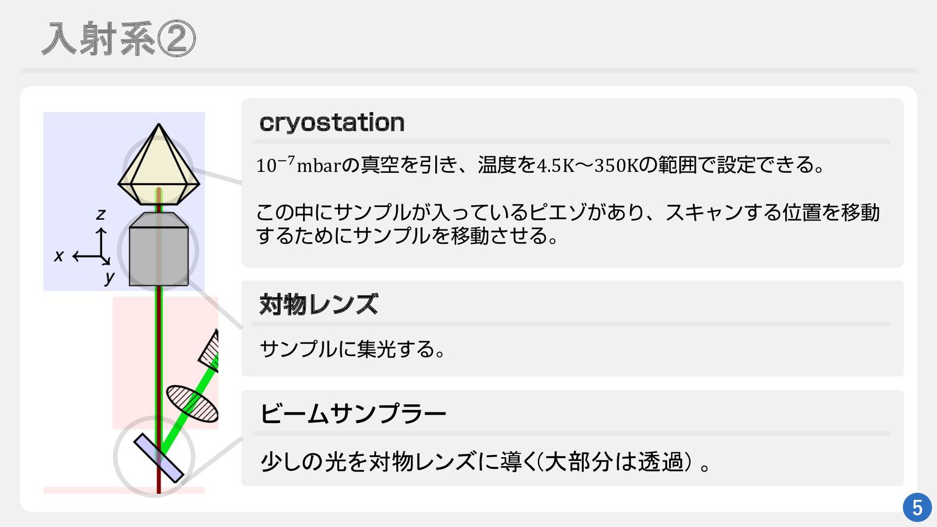 入射系② 5 DSZPTUBUJPO ରϨϯζ 10!"mbarのਅۭΛҾ͖ɺԹΛ4.5Kʙ350KͷൣғͰઃఆͰ͖Δɻ ͜ͷதʹαϯϓϧ͕ೖ͍ͬͯΔϐΤκ͕͋ΓɺεΩϟϯ͢ΔҐஔΛҠಈ ͢ΔͨΊʹαϯϓϧΛҠಈͤ͞Δɻ αϯϓϧʹूޫ͢Δɻ ϏʔϜαϯϓϥʔ 少しの光を対物レンズに導く(大部分は透過)