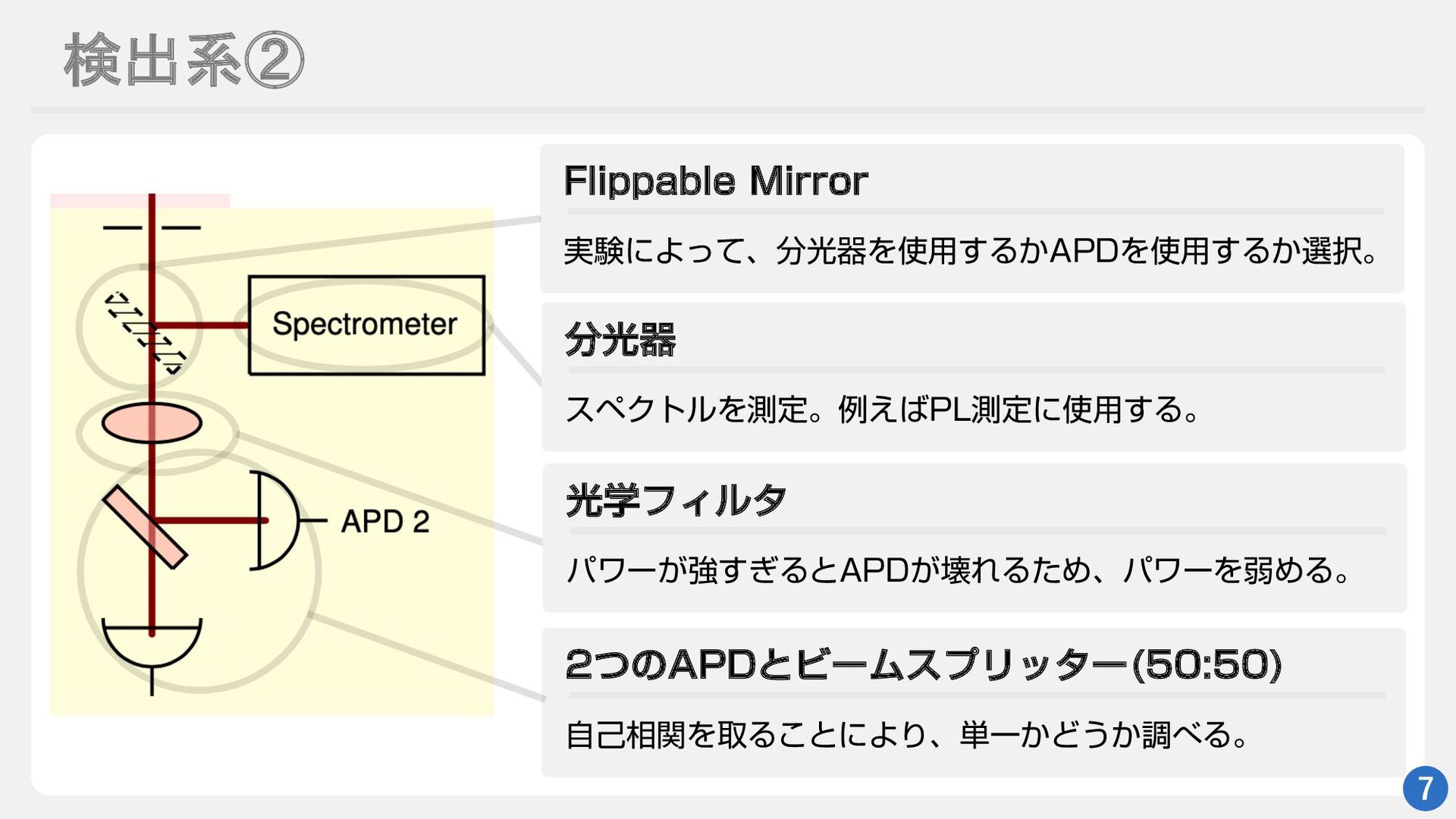 検出系① 6 ରϨϯζ য͔ΒͷޫΛฏߦʹ͢Δɻ ϏʔϜαϯϓϥʔ 大部分の光を検出系に導く。(少し反射) ภޫܥ ϏʔϜεϓϦολʔͰQ·ͨTͷΈΛಁաͨ͠ޙɺ൘ Ͱҙͷภޫʹճసͤ͞Δɻ ϐϯϗʔϧ