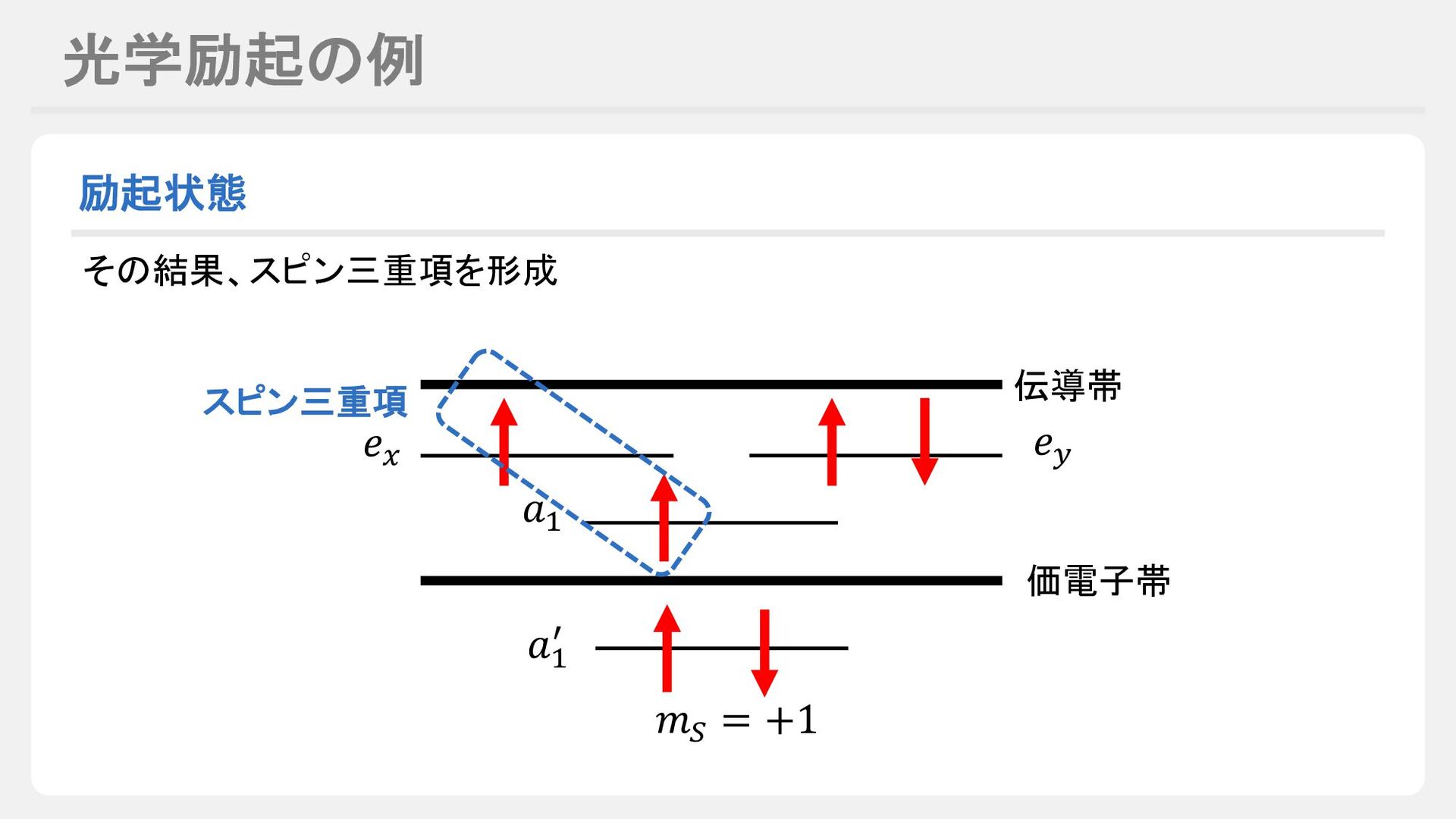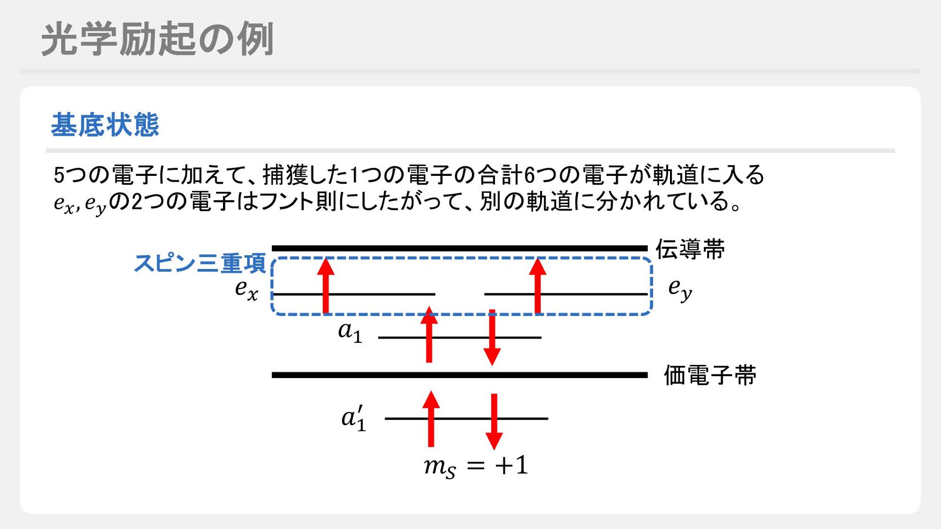 𝑒$ 𝑒% 緑色の光子を吸収すると、𝑎# から𝑒" に電子が励起されるが、パウリの排他原理に よってスピンは反平行に制限される