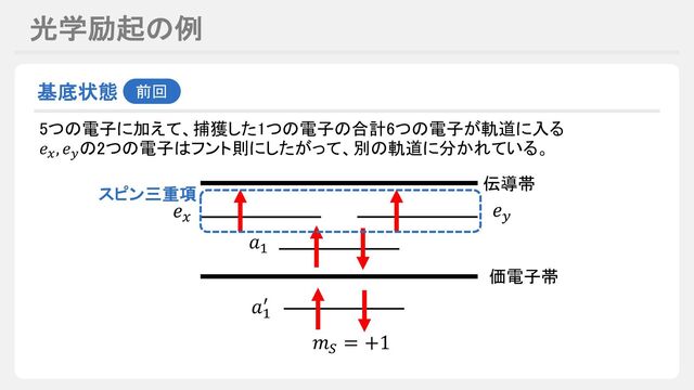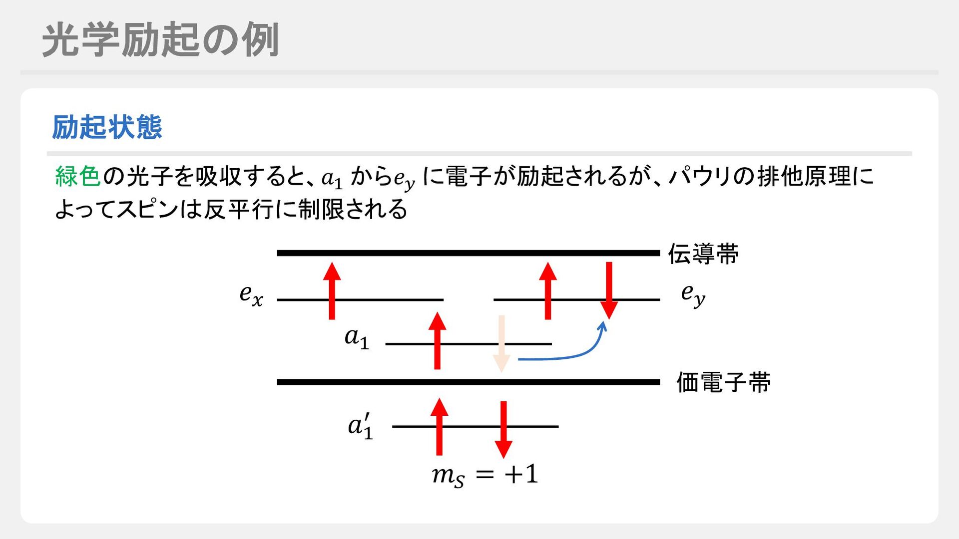 𝑒$ 𝑒% 緑色の光子を吸収すると、𝑎# から𝑒" に電子が励起されるが、パウリの排他原理に よってスピンは反平行に制限される