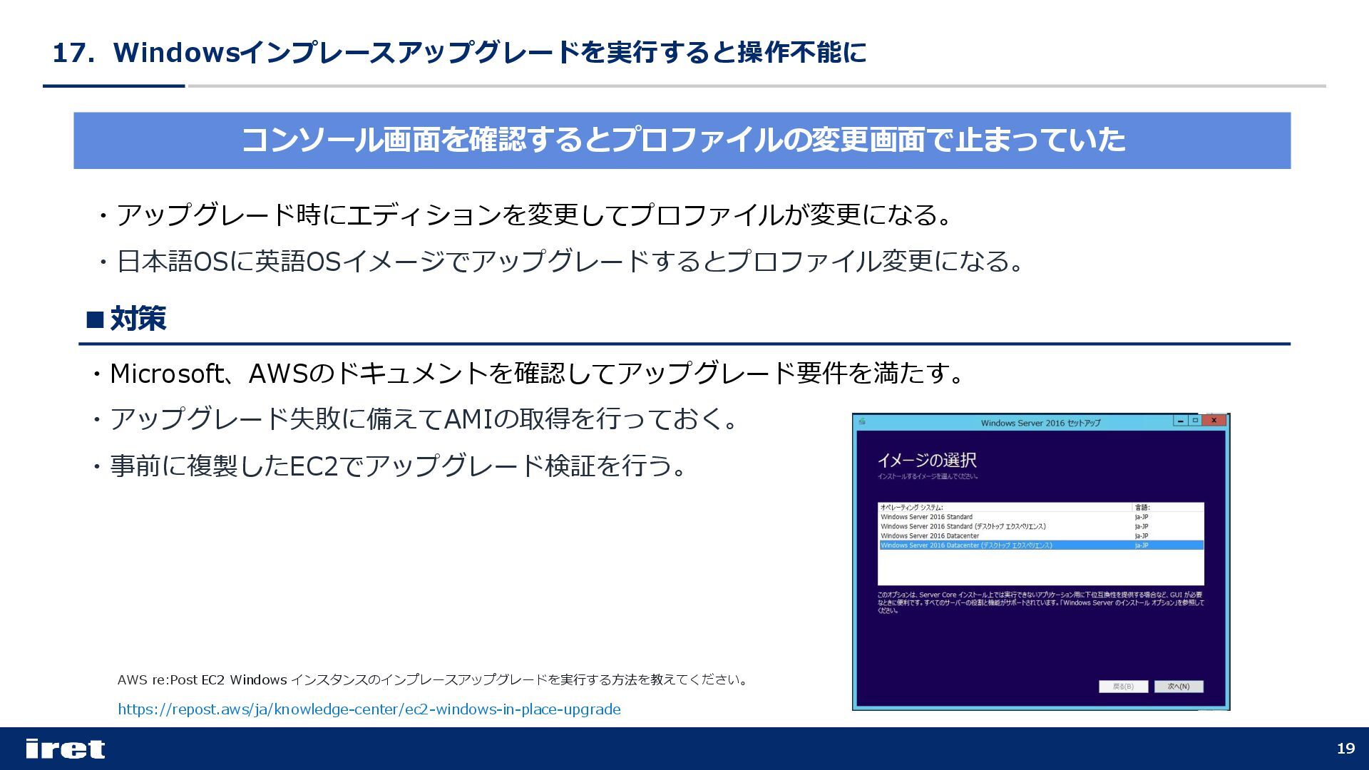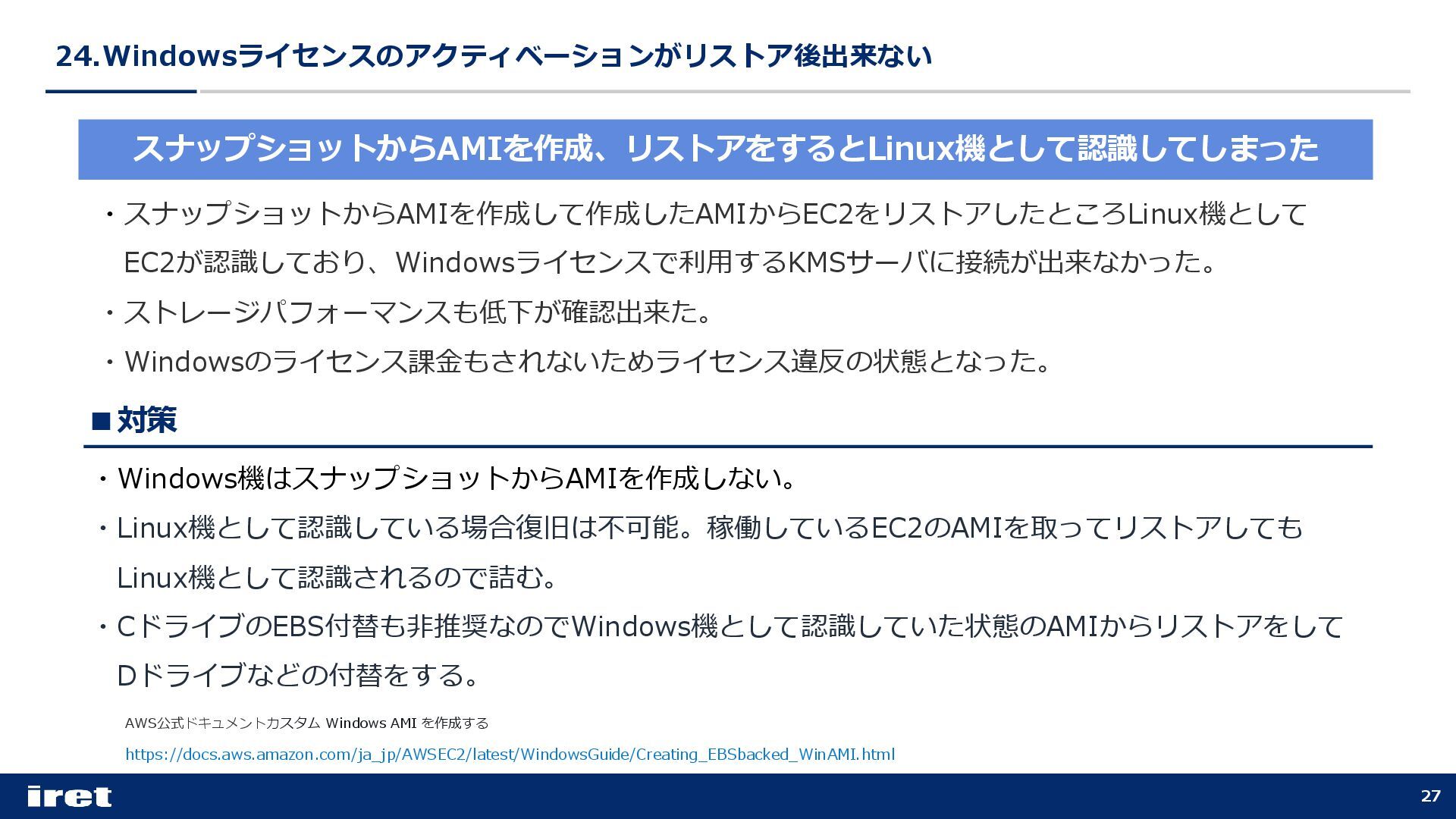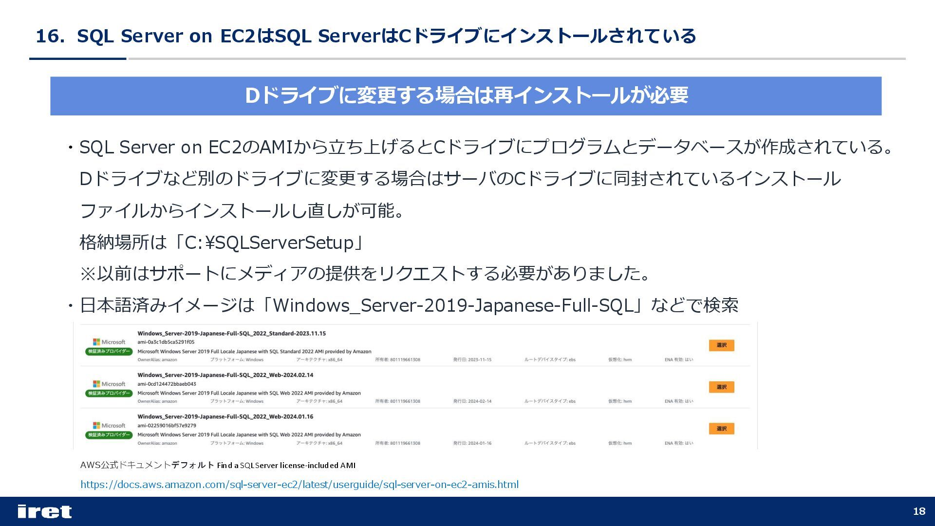 Dドライブなど別のドライブに変更する場合はサーバのCドライブに同封されているインストール ファイルからインストールし直しが可能。 格納場所は「C:¥SQLServerSetup」 ※以前はサポートにメディアの提供をリクエストする必要がありました。 ・日本語済みイメージは「Windows_Server-2019-Japanese-Full-SQL」などで検索 Dドライブに変更する場合は再インストールが必要 https://docs.aws.amazon.com/sql-server-ec2/latest/userguide/sql-server-on-ec2-amis.html https://docs.aws.amazon.com/sql-server-ec2/latest/userguide/sql-server-on-ec2-amis.html AWS公式ドキュメントデフォルト Find a SQL Server license-included AMI
