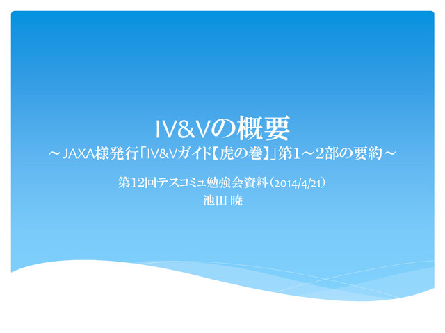 IV&Vの概要 ~JAXA様発行「IV&Vガイド【虎の巻】」第1~2部の要約~ 第12回テスコミュ勉強会資料(2014/4/21) 池田 暁