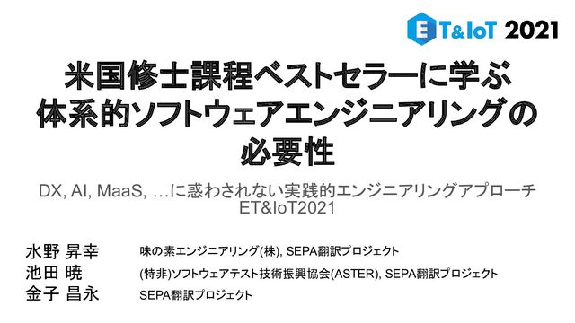 講演者3名を含むSEPA翻訳プロジェクトでは、米国修士課程においてベストセラーとなっている体系的解説書「Software Engineering: A Practitioner's Approach 9th edition」を翻訳し、「実践ソフトウェアエンジニアリング第9版」としてオーム社より12月発刊予定である。https://www.ohmsha.co.jp/book/9784274227943/