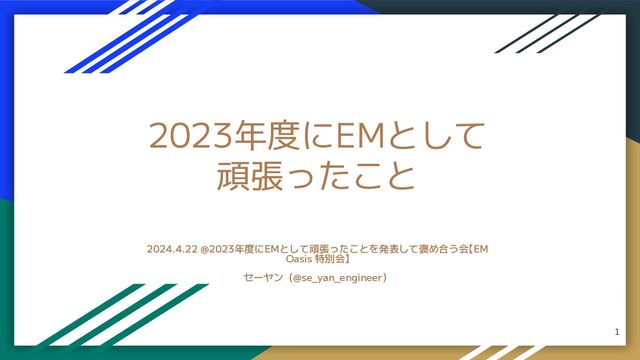 2023年度にEMとして 頑張ったこと 2024.4.22 @2023年度にEMとして頑張ったことを発表して褒め合う会【EM Oasis 特別会】 セーヤン(@se_yan_engineer) 1