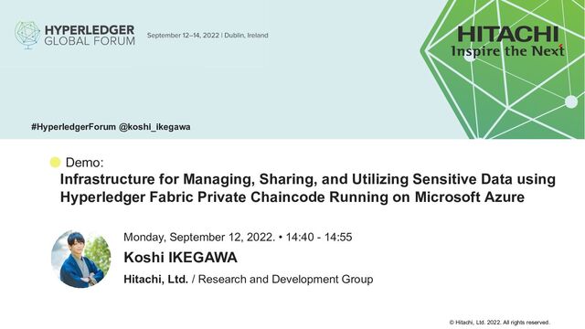 for Managing, Sharing, and Utilizing Sensitive Data using Hyperledger Fabric Private Chaincode Running on Microsoft Azure Hitachi, Ltd. / Research and Development Group Monday, September 12, 2022. • 14:40 - 14:55 Koshi IKEGAWA #HyperledgerForum @koshi_ikegawa