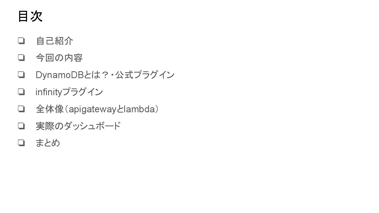 目次 ❏ 自己紹介 ❏ 今回の内容 ❏ DynamoDBとは?・公式プラグイン ❏ infinityプラグイン ❏