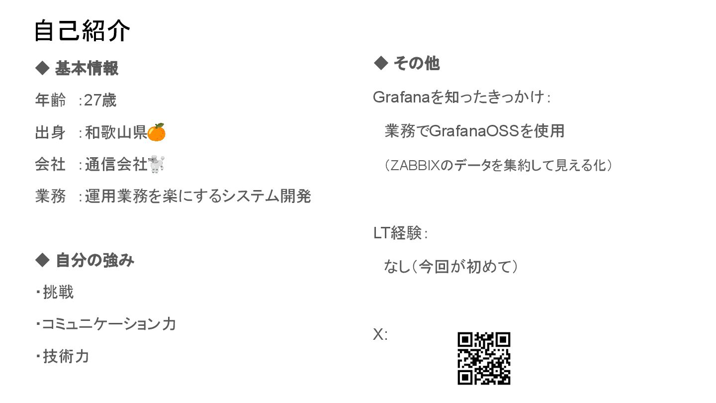・コミュニケーション力 ・技術力 ◆ その他 Grafanaを知ったきっかけ: 業務でGrafanaOSSを使用 (ZABBIXのデータを集約して見える化) LT経験: なし(今回が初めて) X: