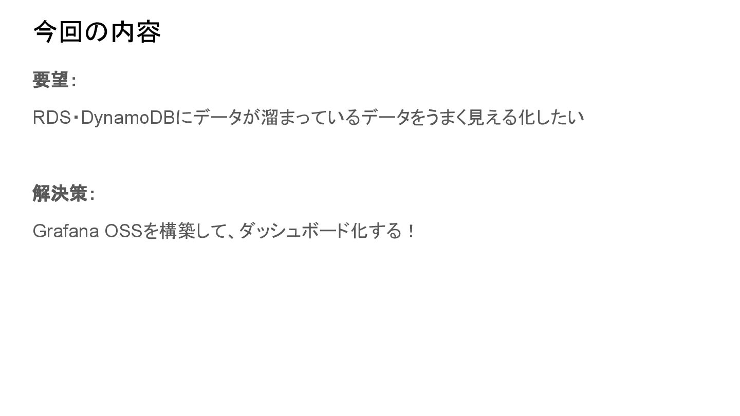 今回の内容 要望: RDS・DynamoDBにデータが溜まっているデータをうまく見える化したい 解決策: Grafana OSSを構築して、ダッシュボード化する!