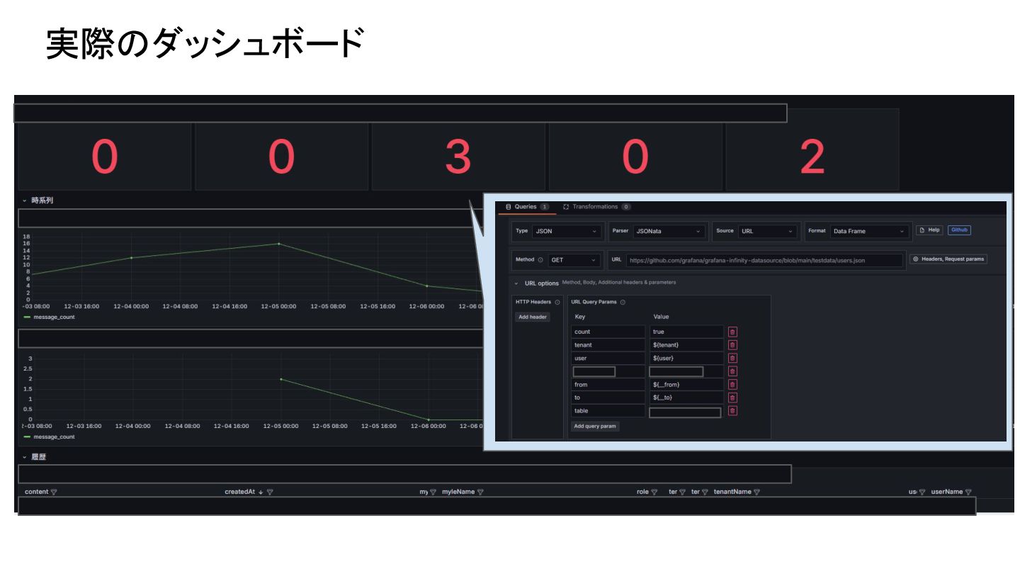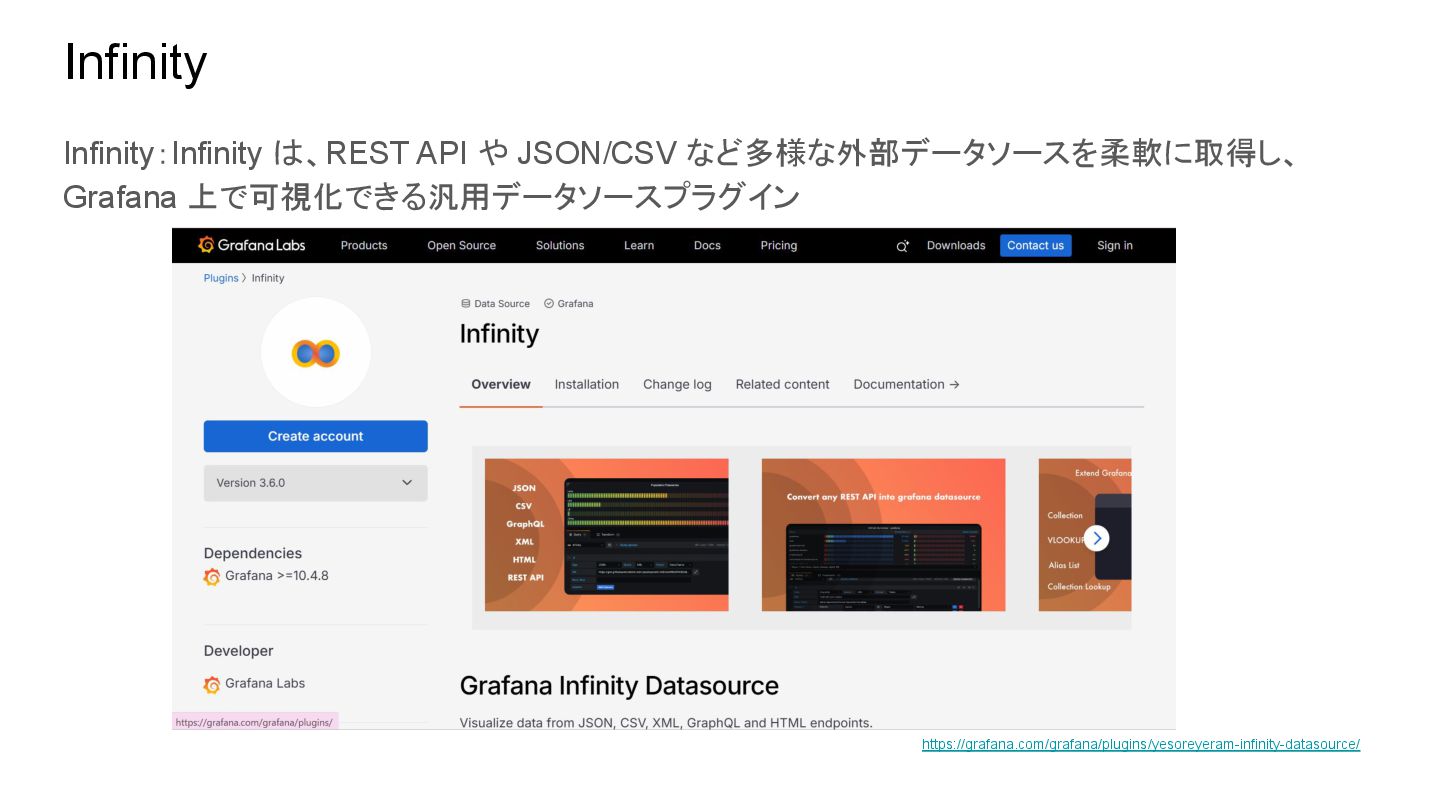 Infinity:Infinity は、REST API や JSON/CSV など多様な外部データソースを柔軟に取得し、 Grafana 上で可視化できる汎用データソースプラグイン Infinity https://grafana.com/grafana/plugins/yesoreyeram-infinity-datasource/