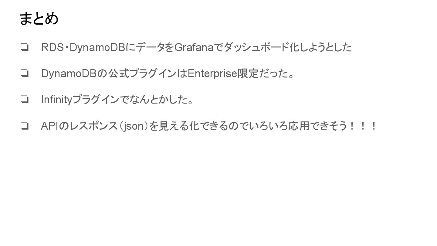 まとめ ❏ RDS・DynamoDBにデータをGrafanaでダッシュボード化しようとした ❏ DynamoDBの公式プラグインはEnterprise限定だった。 ❏ Infinityプラグインでなんとかした。 ❏ APIのレスポンス(json)を見える化できるのでいろいろ応用できそう!!!