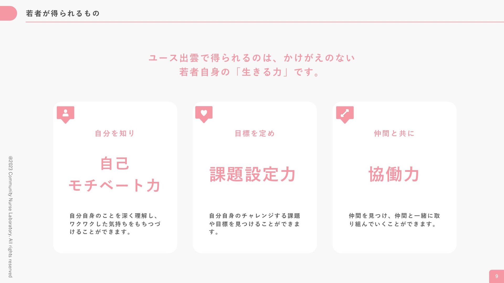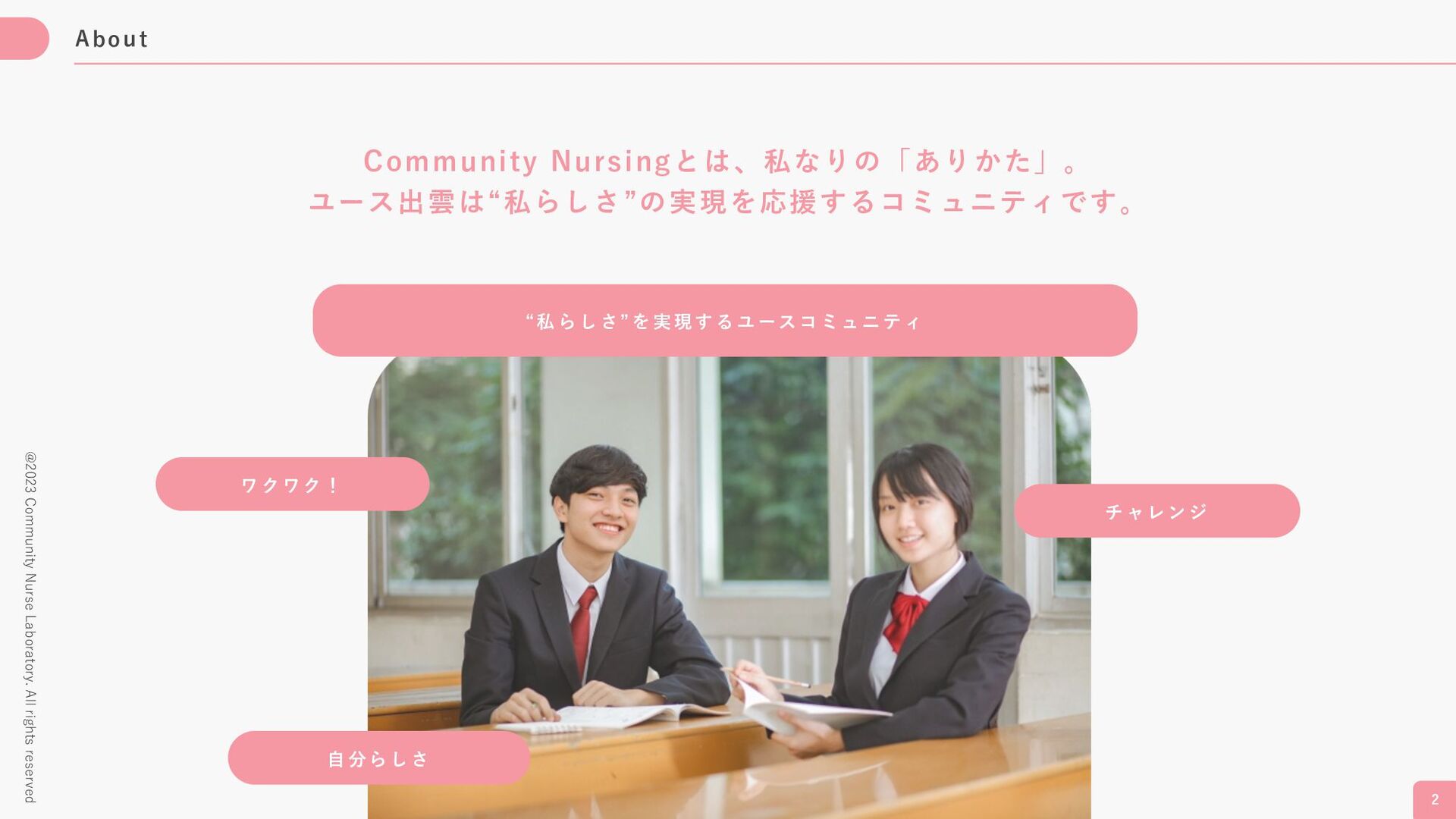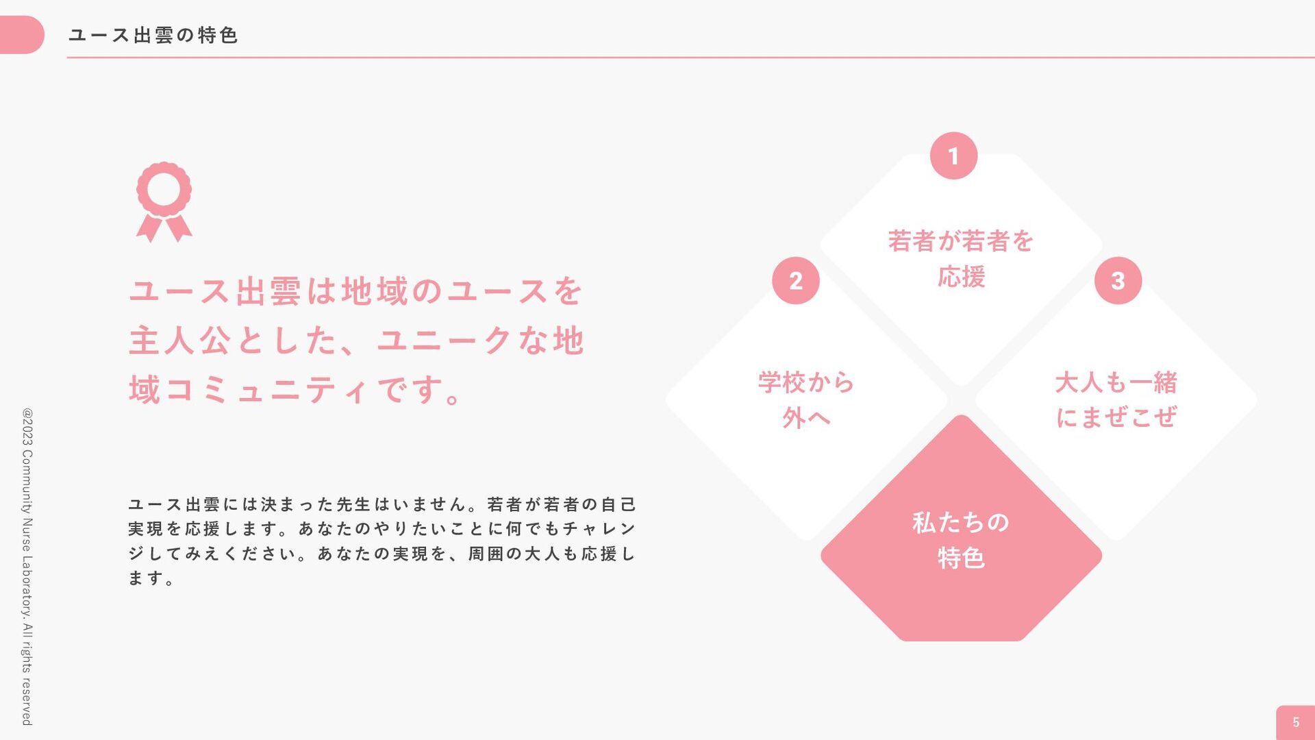 た先 ⽣ は い ませ ん 。 若 者が 若者 の ⾃⼰ 実現を 応援 し ます。 あな たの や り た いこ と に何 で も チ ャ レン ジして みえ く ださい 。あ なた の 実 現 を、 周 囲の ⼤ ⼈ も 応 援し ます。 学校から 外へ ⼤⼈も⼀緒 にまぜこぜ 若者が若者を 応援 私たちの 特⾊ 1 2 3 @2023 Community Nurse Laboratory. All rights reserved