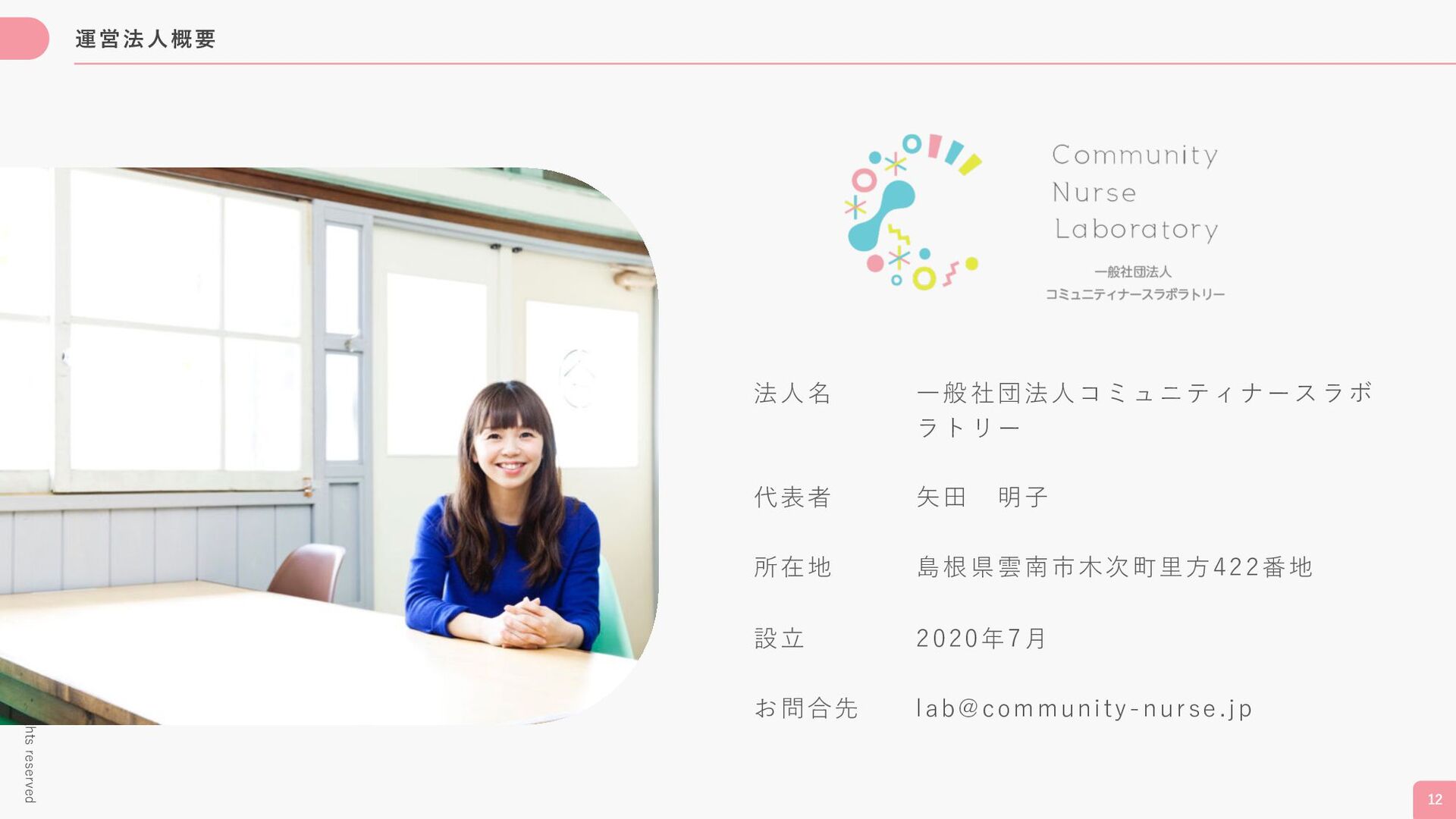運営法⼈概要 12 @2023 Community Nurse Laboratory. All rights reserved