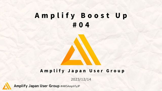 - 19:10 はじめに 池田 健人 (Amplify Japan User Group) 【第1部】re:Invent re:Cap 19:10 - 19:25 【SAセッション】 稲田 大陸 (AWS Japan Solutions Architect) 19:25 - 19:35 AWS re:Invent 2023 現地での体験 桐本 靖規 (Amplify Japan User Group) 19:35 - 19:50 さっそくチェック! Amplify Gen2のデプロイ体験 足立 優司 (Amplify Japan User Group) 【第2部】LT 19:50 - 20:05 サービス立ち上げから運用で感じた AWS Amplifyの開発者体験を紹介 山下 義陽 (NTTスマートコネクト ) 20:05 - 20:20 本番環境でAmplifyを3年くらい使ってみている弊社環境のご紹介 三浦 一樹 (北海道テレビ放送 ) 20:20 - 20:30 クロージング 池田 健人 (Amplify Japan User Group) 質問・コメントはSlidoで募集中 ※質疑応答は第 1部は最後にまとめて、第 2部は各発表の後に時間を設けます
