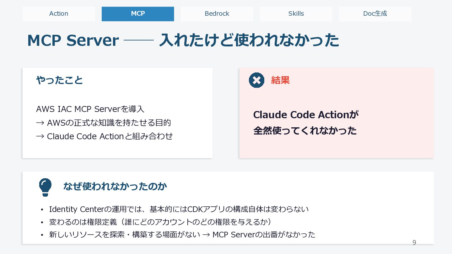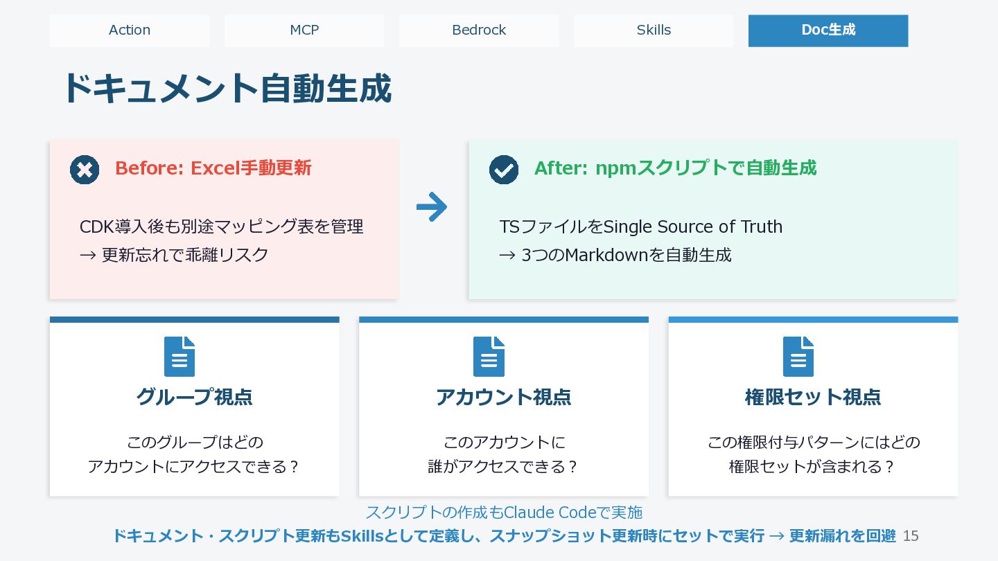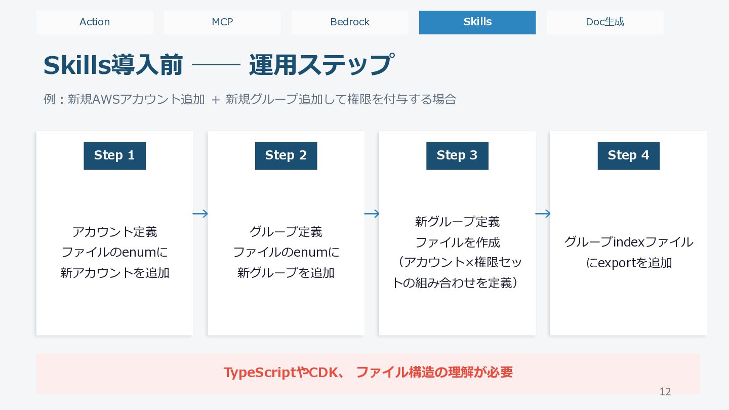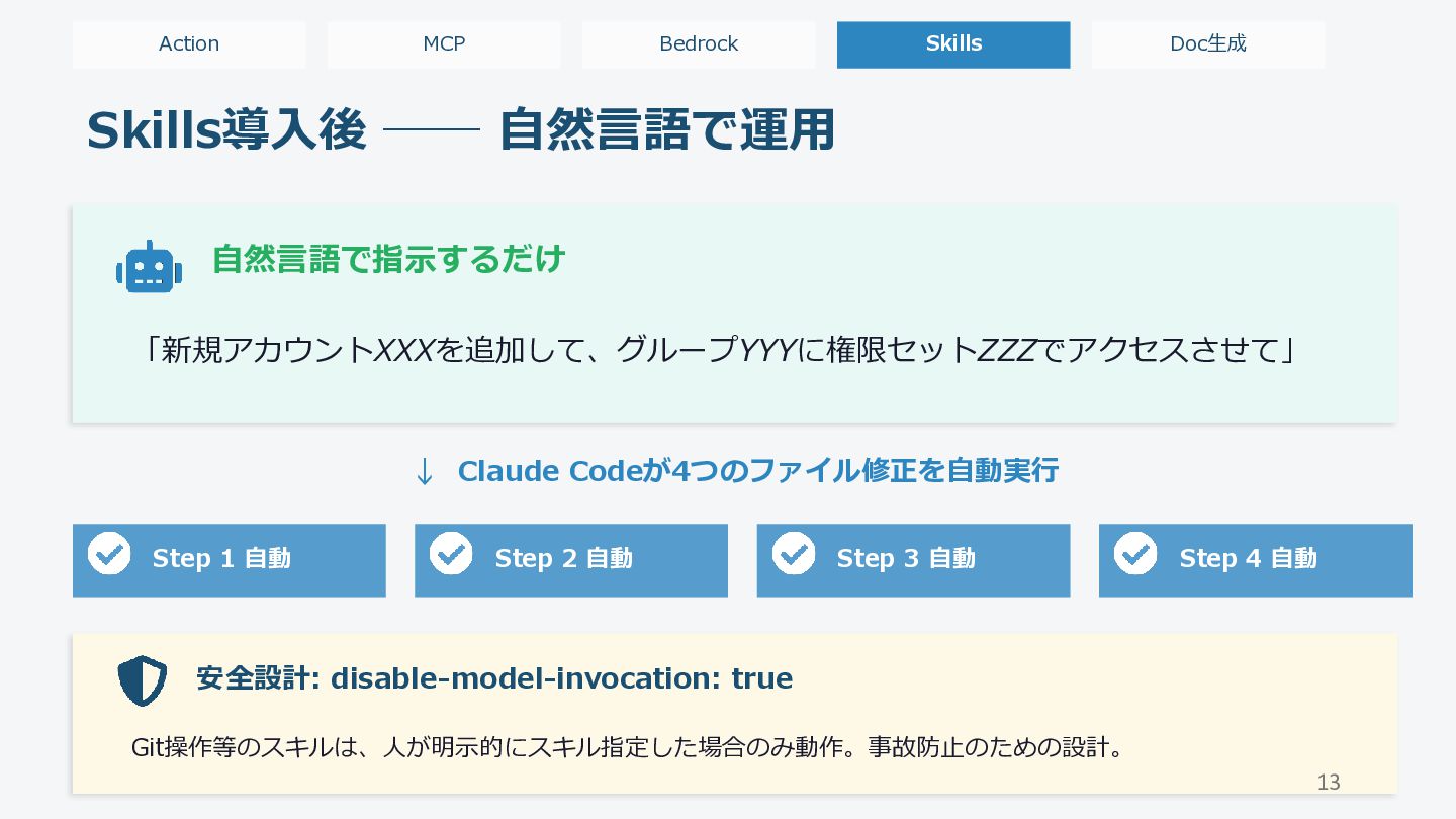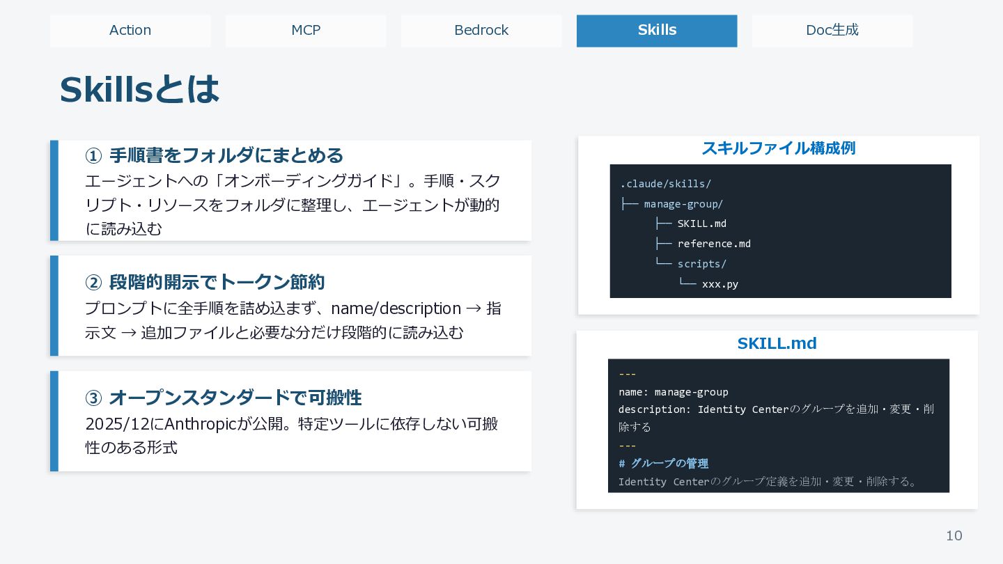 リプト・リソースをフォルダに整理し、エージェントが動的 に読み込む ② 段階的開示でトークン節約 プロンプトに全手順を詰め込まず、name/description → 指 示文 → 追加ファイルと必要な分だけ段階的に読み込む ③ オープンスタンダードで可搬性 2025/12にAnthropicが公開。特定ツールに依存しない可搬 性のある形式 .claude/skills/ ├── manage-group/ ├── SKILL.md ├── reference.md └── scripts/ └── xxx.py 10 SKILL.md --- name: manage-group description: Identity Centerのグループを追加・変更・削 除する --- # グループの管理 Identity Centerのグループ定義を追加・変更・削除する。