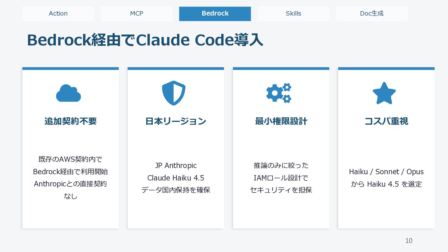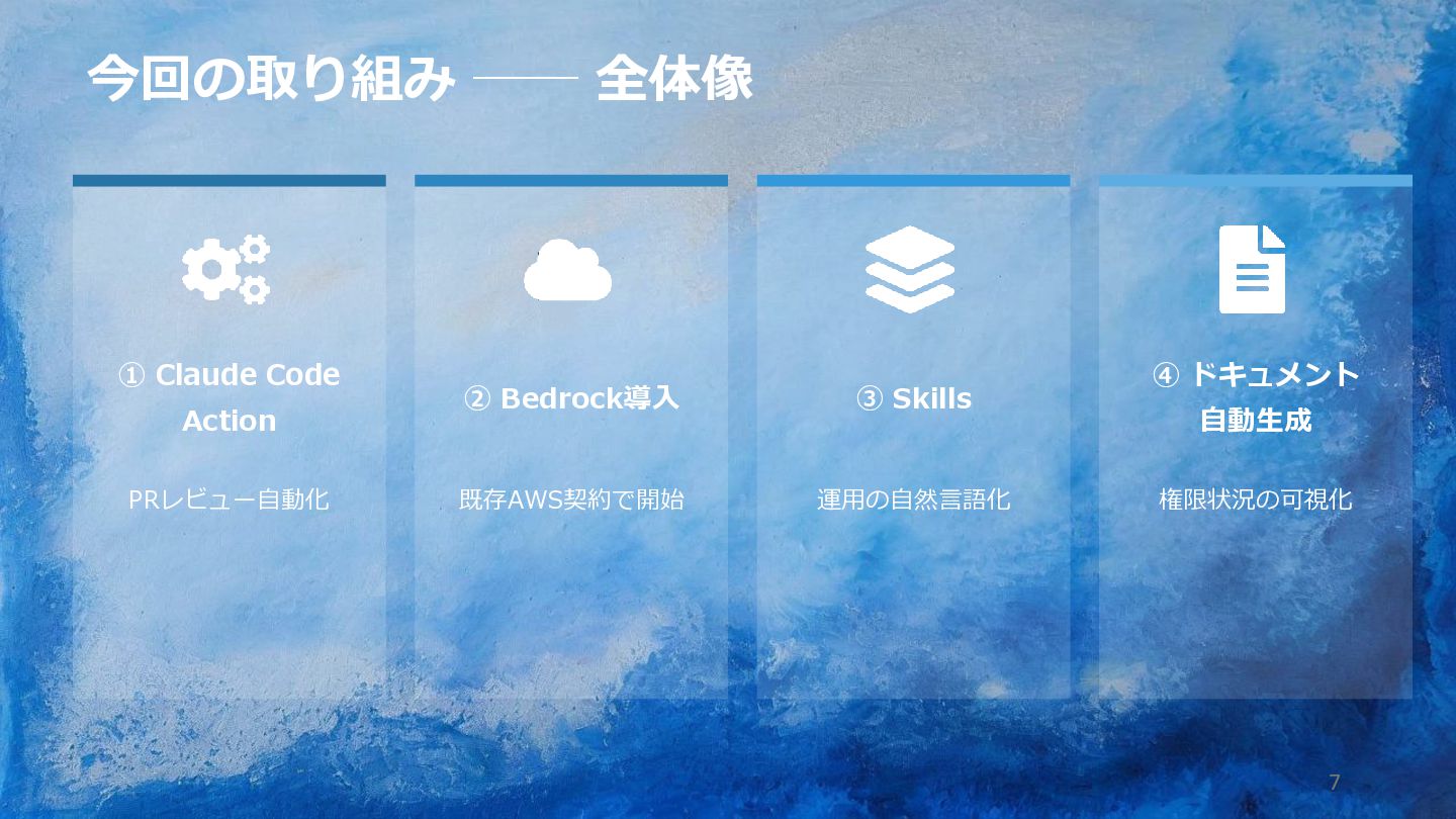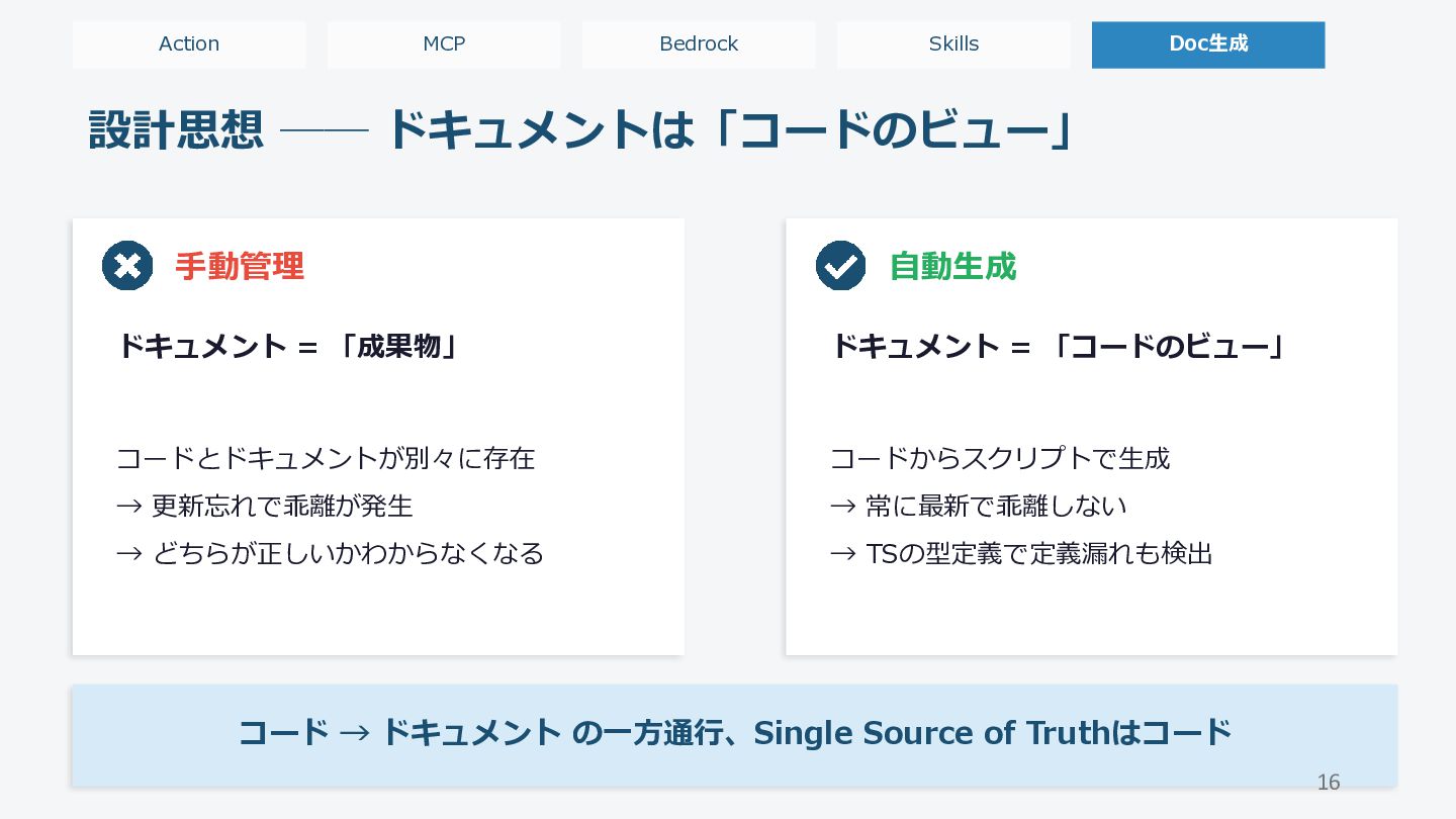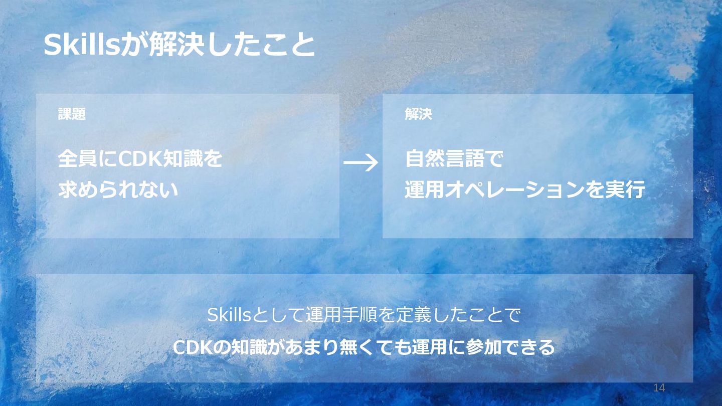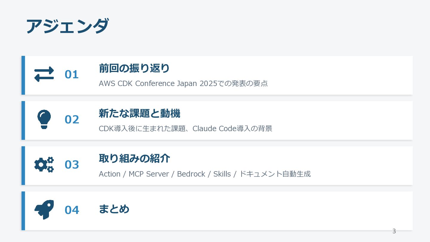 リプト・リソースをフォルダに整理し、エージェントが動的 に読み込む ② 段階的開示でトークン節約 プロンプトに全手順を詰め込まず、name/description → 指 示文 → 追加ファイルと必要な分だけ段階的に読み込む ③ オープンスタンダードで可搬性 2025/12にAnthropicが公開。特定ツールに依存しない可搬 性のある形式 .claude/skills/ ├── manage-group/ ├── SKILL.md ├── reference.md └── scripts/ └── xxx.py 10 SKILL.md --- name: manage-group description: Identity Centerのグループを追加・変更・削 除する --- # グループの管理 Identity Centerのグループ定義を追加・変更・削除する。
