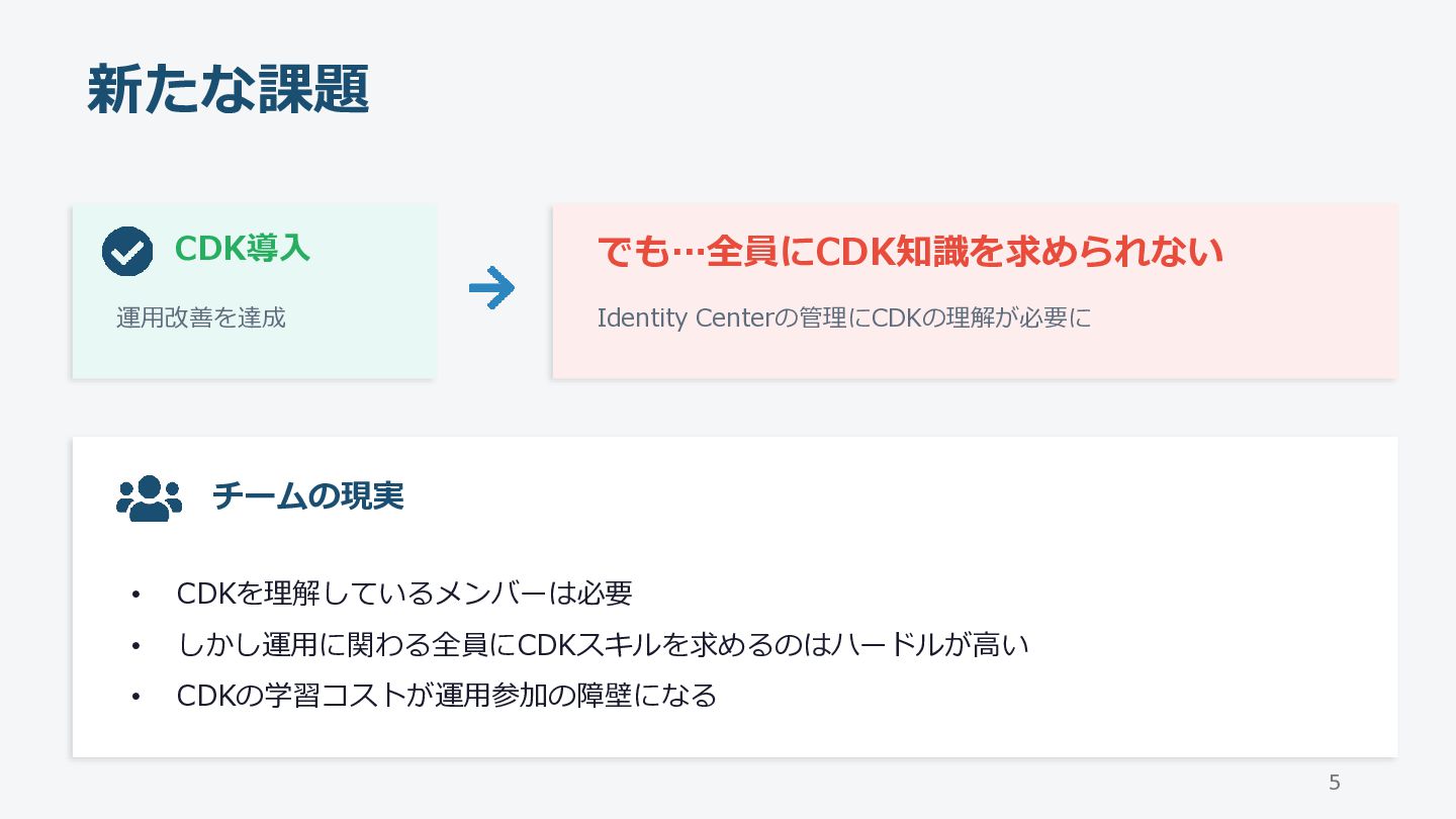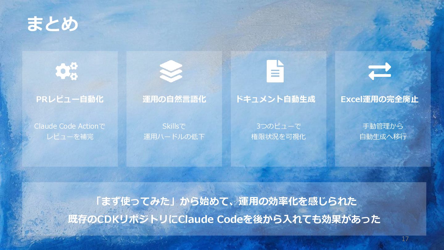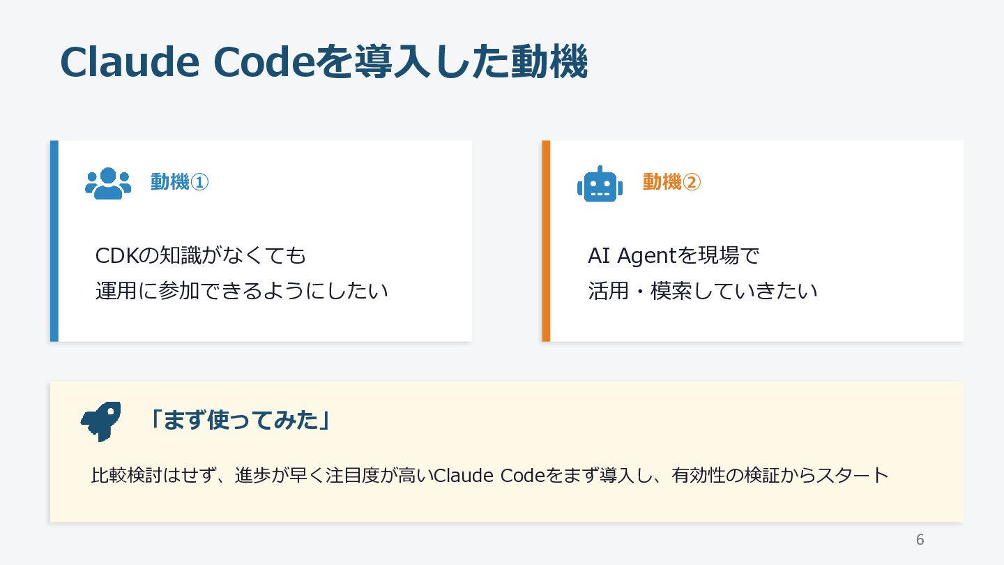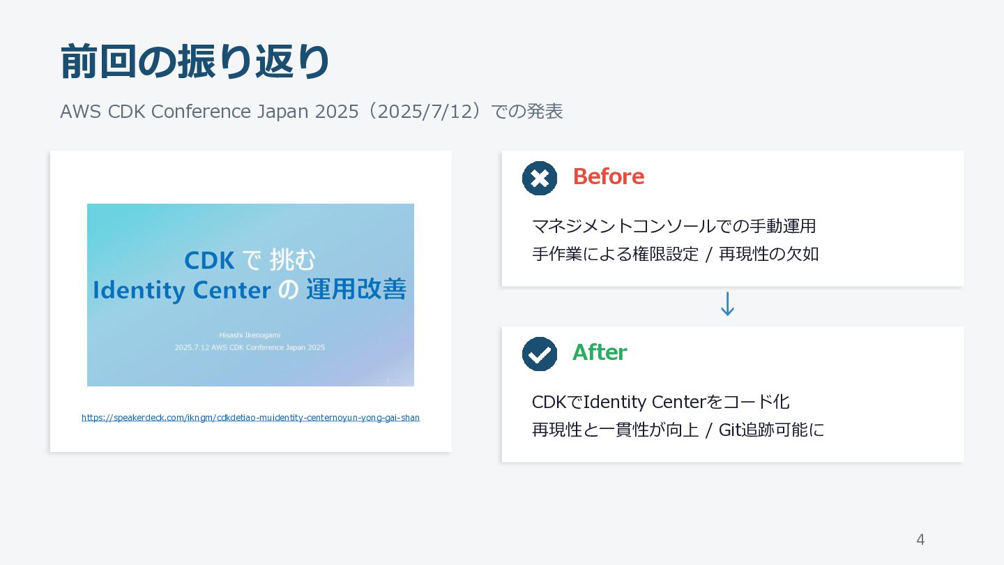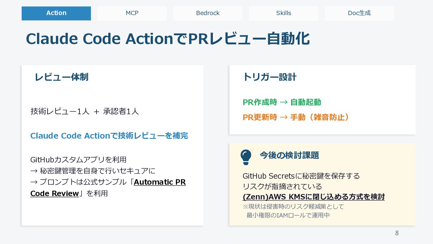 リプト・リソースをフォルダに整理し、エージェントが動的 に読み込む ② 段階的開示でトークン節約 プロンプトに全手順を詰め込まず、name/description → 指 示文 → 追加ファイルと必要な分だけ段階的に読み込む ③ オープンスタンダードで可搬性 2025/12にAnthropicが公開。特定ツールに依存しない可搬 性のある形式 .claude/skills/ ├── manage-group/ ├── SKILL.md ├── reference.md └── scripts/ └── xxx.py 10 SKILL.md --- name: manage-group description: Identity Centerのグループを追加・変更・削 除する --- # グループの管理 Identity Centerのグループ定義を追加・変更・削除する。