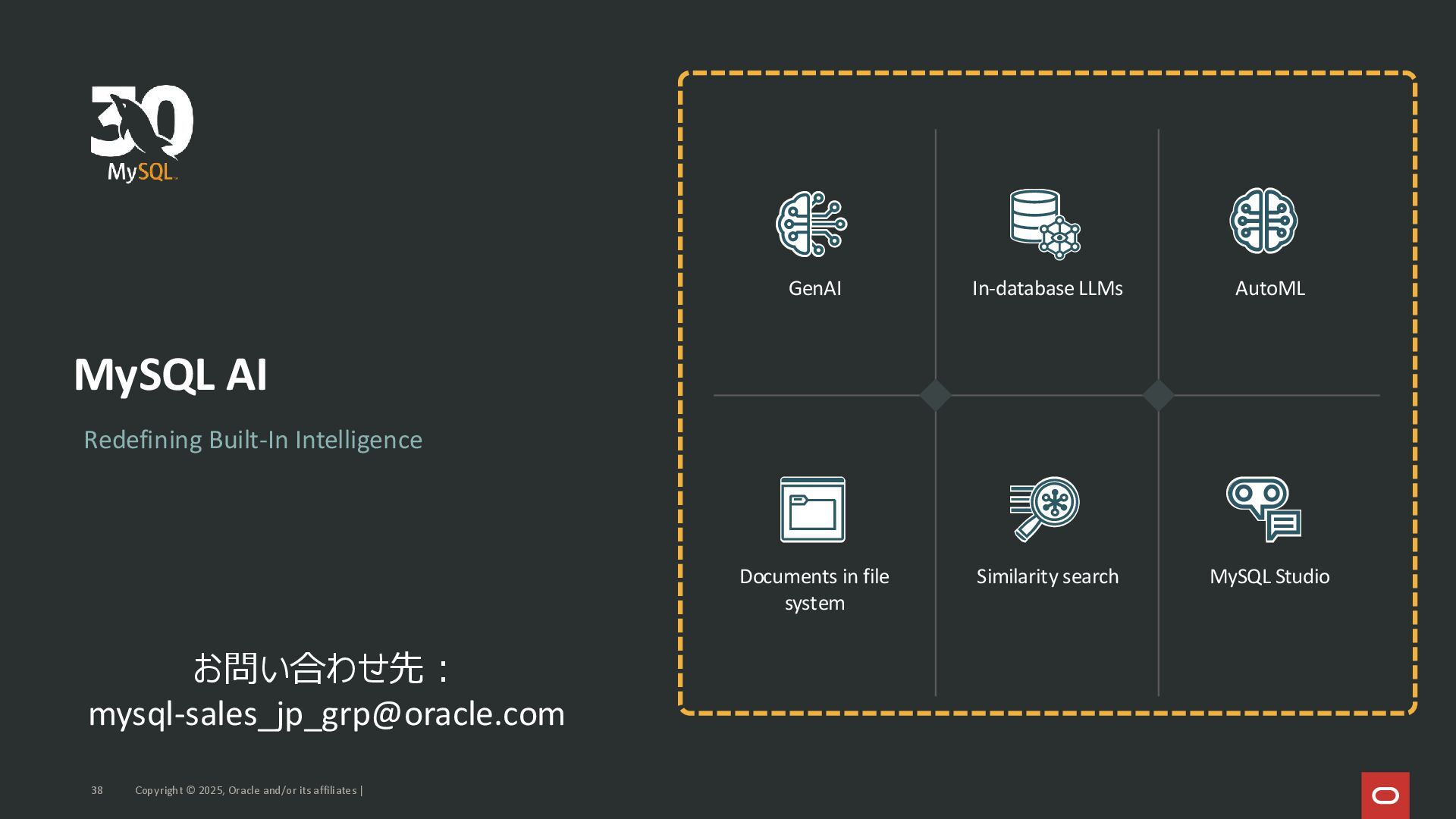 | In-database LLMs Documents in file system GenAI MySQL Studio Similarity search AutoML Redefining Built-In Intelligence お問い合わせ先: