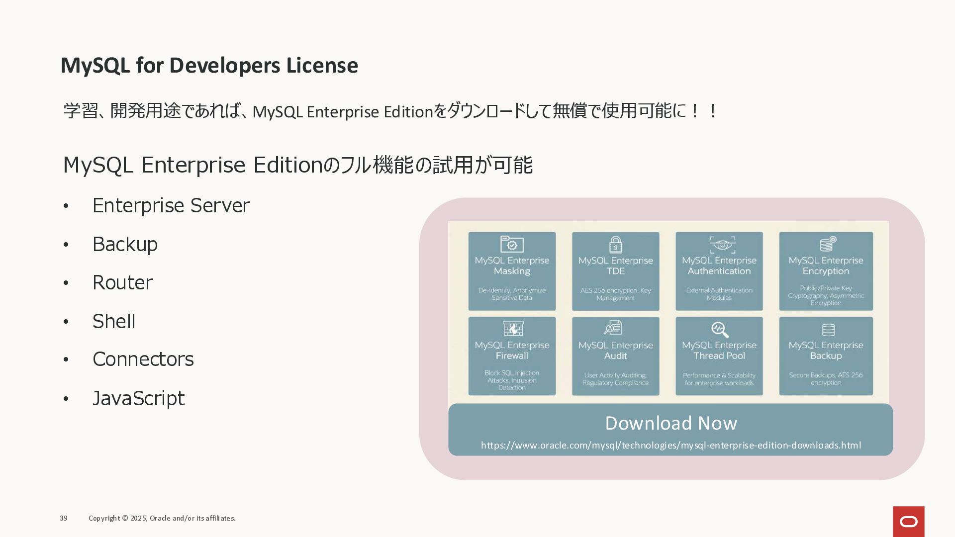 its affiliates. MySQL Enterprise Editionのフル機能の試用が可能 • Enterprise Server • Backup • Router • Shell • Connectors • JavaScript 学習、開発用途であれば、MySQL Enterprise Editionをダウンロードして無償で使用可能に!! Download Now https://www.oracle.com/mysql/technologies/mysql-enterprise-edition-downloads.html