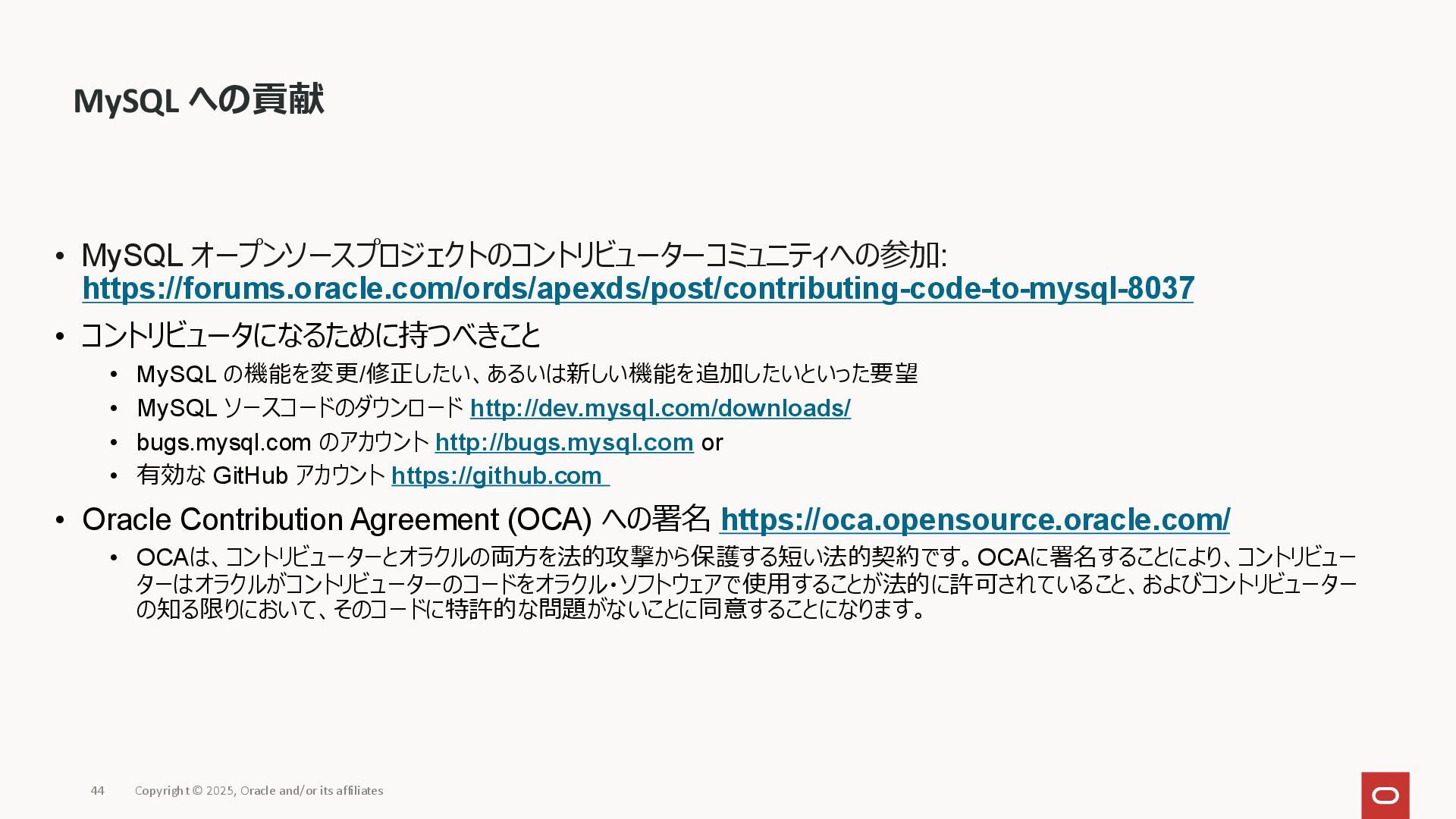 の機能を変更/修正したい、あるいは新しい機能を追加したいといった要望 • MySQL ソースコードのダウンロード http://dev.mysql.com/downloads/ • bugs.mysql.com のアカウント http://bugs.mysql.com or • 有効な GitHub アカウント https://github.com • Oracle Contribution Agreement (OCA) への署名 https://oca.opensource.oracle.com/ • OCAは、コントリビューターとオラクルの両方を法的攻撃から保護する短い法的契約です。OCAに署名することにより、コントリビュー ターはオラクルがコントリビューターのコードをオラクル・ソフトウェアで使用することが法的に許可されていること、およびコントリビューター の知る限りにおいて、そのコードに特許的な問題がないことに同意することになります。 Copyright © 2025, Oracle and/or its affiliates 44
