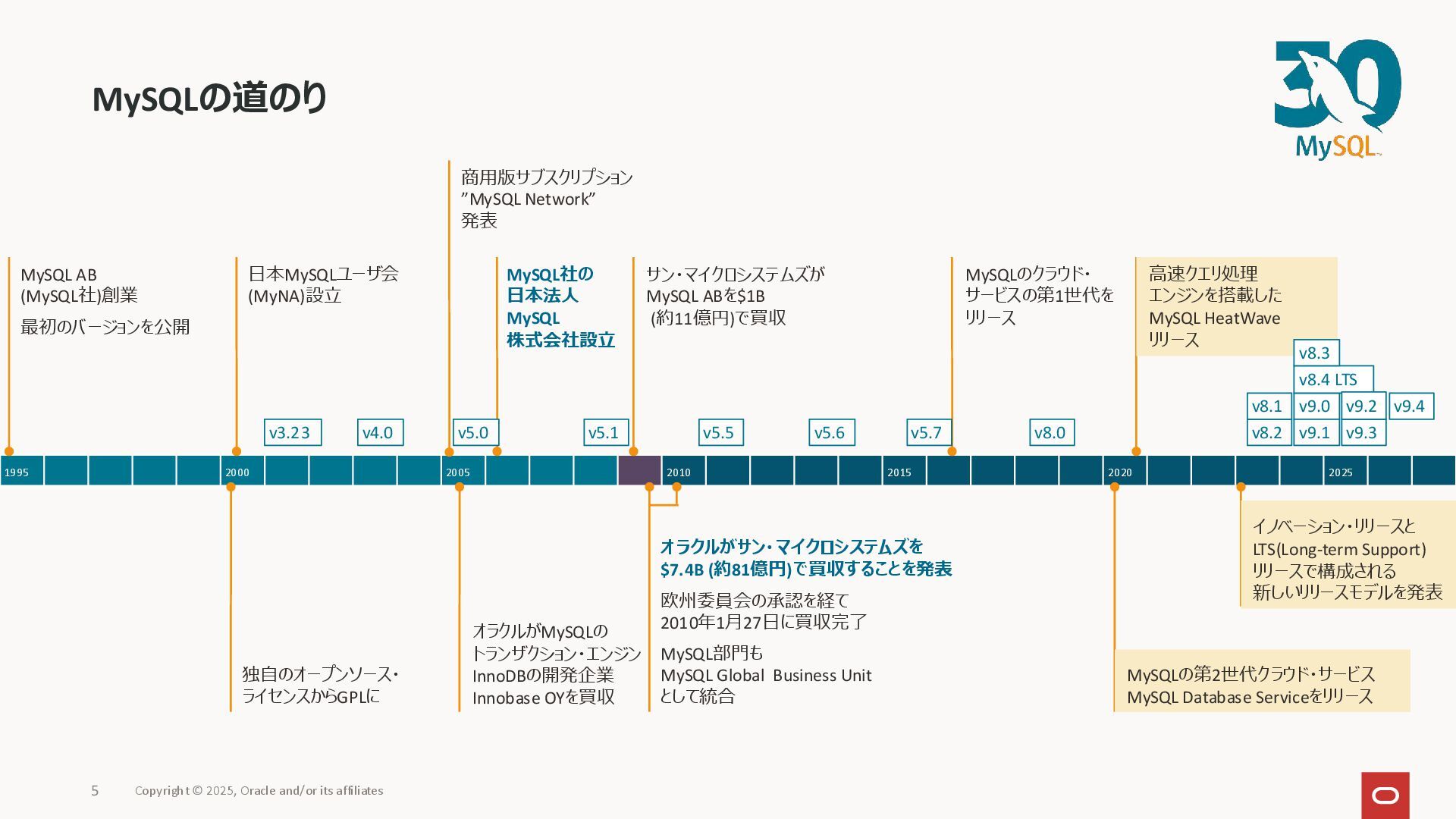 2000 2005 2010 2015 2020 2025 MySQL AB (MySQL社)創業 最初のバージョンを公開 独自のオープンソース・ ライセンスからGPLに 商用版サブスクリプション ”MySQL Network” 発表 オラクルがMySQLの トランザクション・エンジン InnoDBの開発企業 Innobase OYを買収 サン・マイクロシステムズが MySQL ABを$1B (約11億円)で買収 オラクルがサン・マイクロシステムズを $7.4B (約81億円)で買収することを発表 欧州委員会の承認を経て 2010年1月27日に買収完了 MySQL部門も MySQL Global Business Unit として統合 MySQL社の 日本法人 MySQL 株式会社設立 MySQLのクラウド・ サービスの第1世代を リリース 高速クエリ処理 エンジンを搭載した MySQL HeatWave リリース MySQLの第2世代クラウド・サービス MySQL Database Serviceをリリース v3.23 v4.0 v5.1 v5.0 v5.5 v5.6 v5.7 v8.0 v8.2 v8.1 イノベーション・リリースと LTS(Long-term Support) リリースで構成される 新しいリリースモデルを発表 v9.0 v8.4 LTS v8.3 v9.3 v9.1 日本MySQLユーザ会 (MyNA)設立 v9.2 v9.4