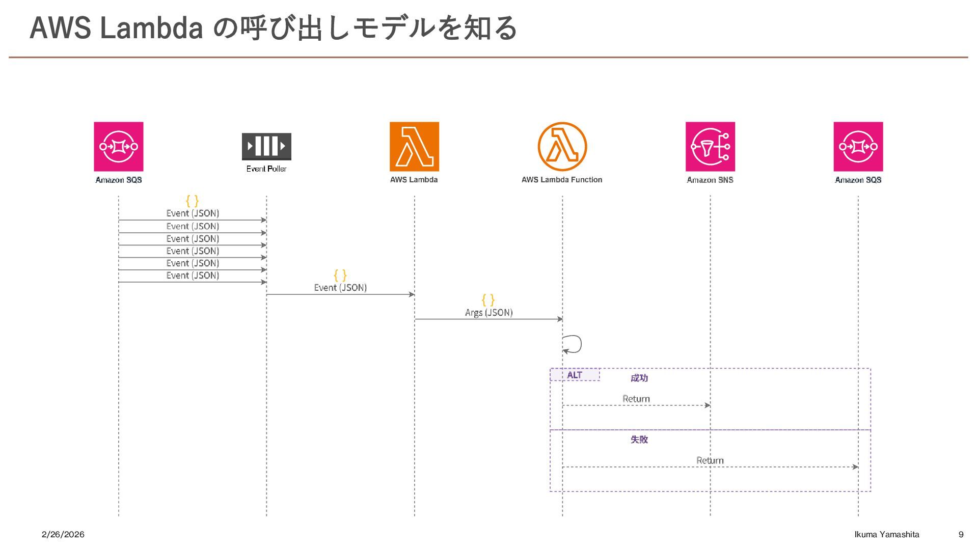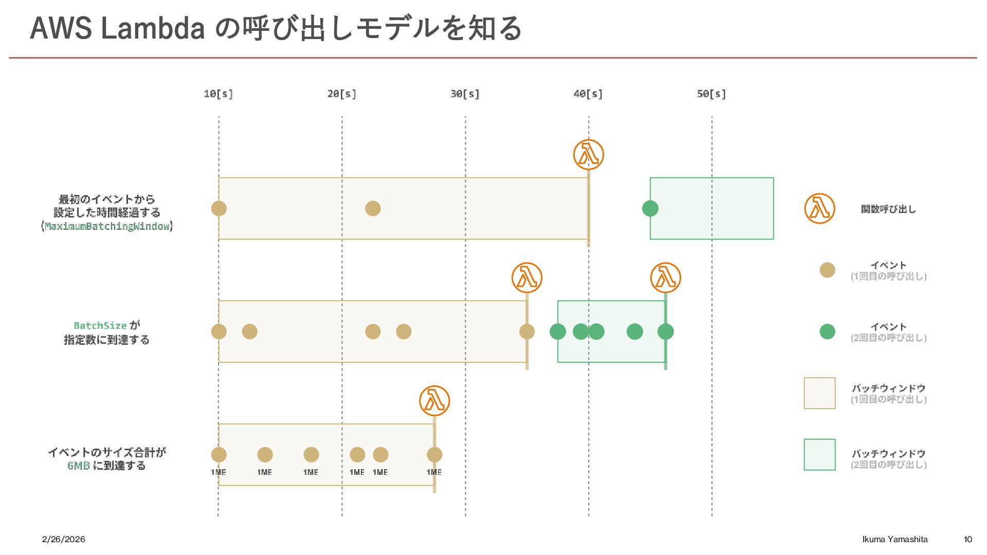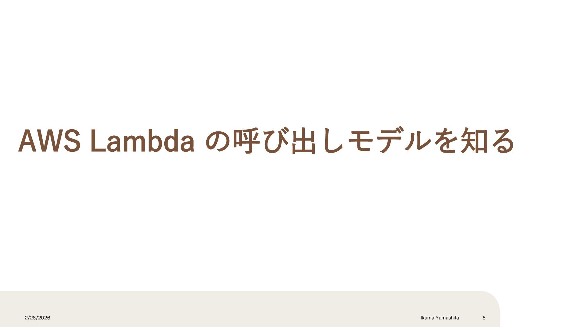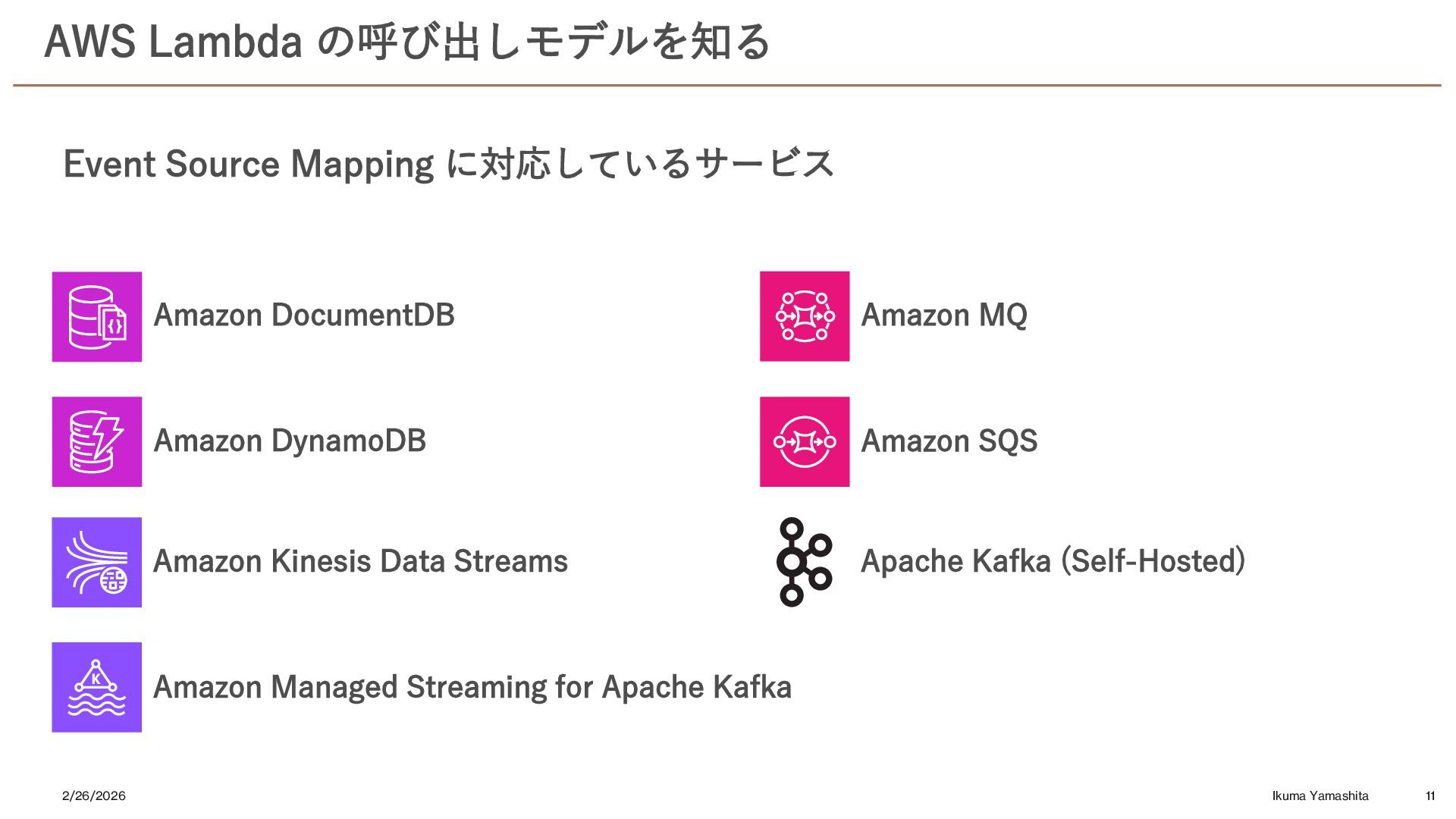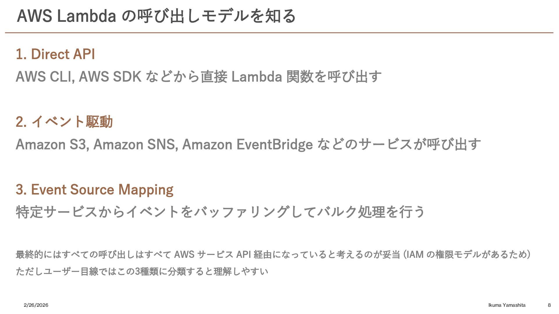 AWS CLI, AWS SDK などから直接 Lambda 関数を呼び出す 2. イベント駆動 Amazon S3, Amazon SNS, Amazon EventBridge などのサービスが呼び出す 3. Event Source Mapping 特定サービスからイベントをバッファリングしてバルク処理を行う 最終的にはすべての呼び出しはすべて AWS サービス API 経由になっていると考えるのが妥当 (IAM の権限モデルがあるため) ただしユーザー目線ではこの3種類に分類すると理解しやすい