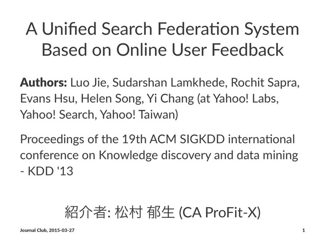 Authors: Luo Jie, Sudarshan Lamkhede, Rochit Sapra, Evans Hsu, Helen Song, Yi Chang (at Yahoo! Labs, Yahoo! Search, Yahoo! Taiwan) Proceedings of the 19th ACM SIGKDD interna:onal conference on Knowledge discovery and data mining - KDD '13 հऀ: দଜ Үੜ (CA ProFit-X) Journal Club, 2015-03-27 1