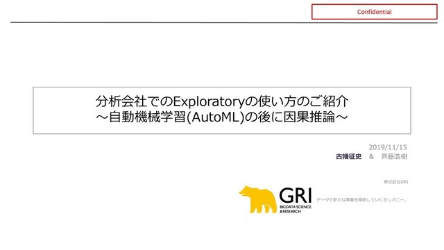 株式会社GRI データで新たな事業を開発していくカンパニー。 Confidential 分析会社でのExploratoryの使い方のご紹介 ~自動機械学習(AutoML)の後に因果推論~ 2019/11/15 古幡征史 & 斉藤浩樹