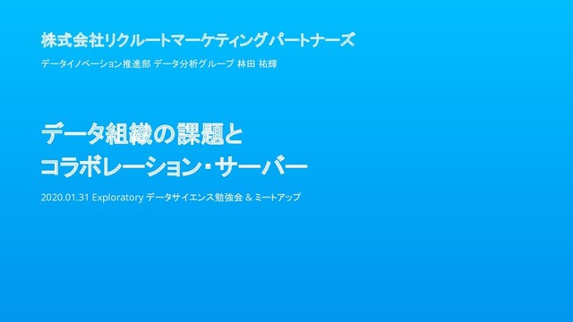 データ組織の課題と コラボレーション・サーバー データイノベーション推進部 データ分析グループ 林田 祐輝 株式会社リクルートマーケティングパートナーズ 2020.01.31 Exploratory データサイエンス勉強会