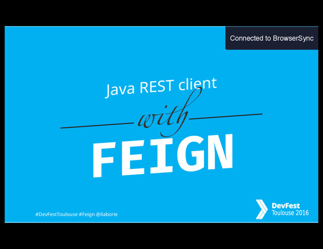 allow you to dynamically implement the interface. Use the java.net.HttpURLConnection to send and process HTTP requests. (by default) Use the reflection API to extract meta-data. If you prefer JAX-RS annotation you can use feign-jaxrs . #DevFestToulouse #Feign @ilaborie 12 Connected to BrowserSync