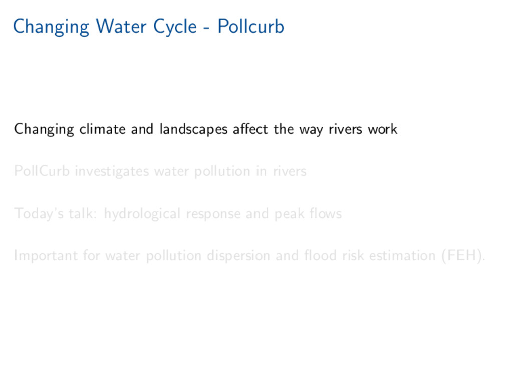 the way rivers work PollCurb investigates water pollution in rivers Today’s talk: hydrological response and peak flows Important for water pollution dispersion and flood risk estimation (FEH).