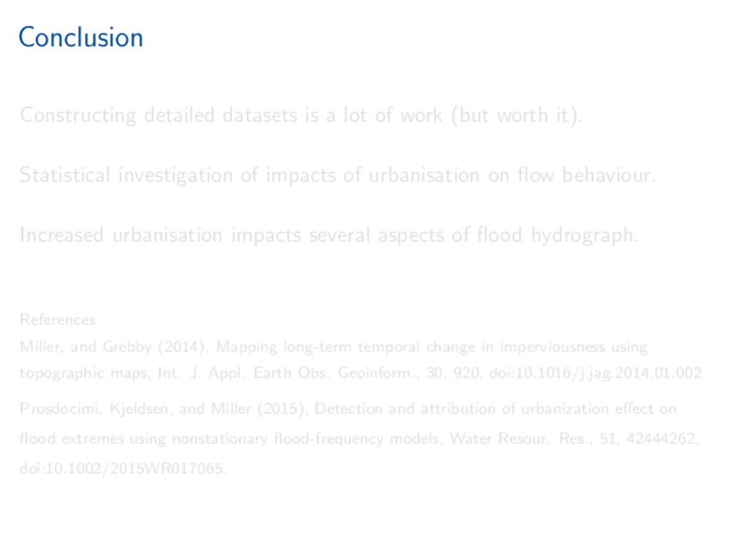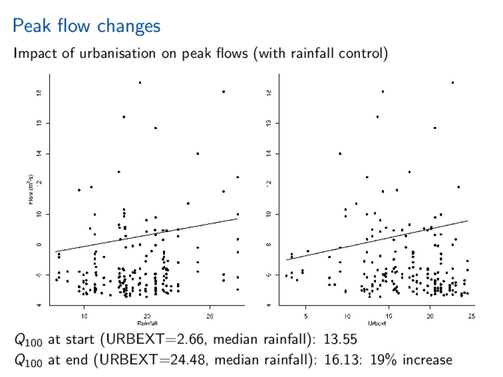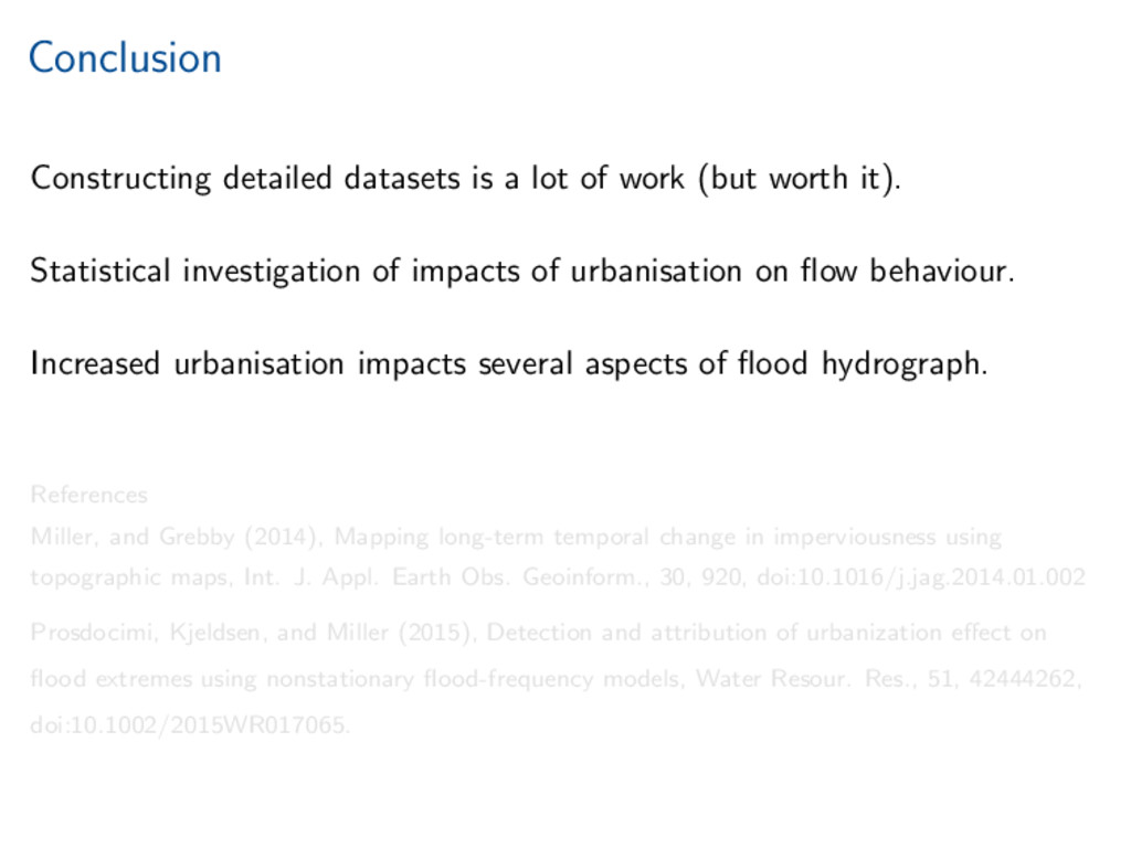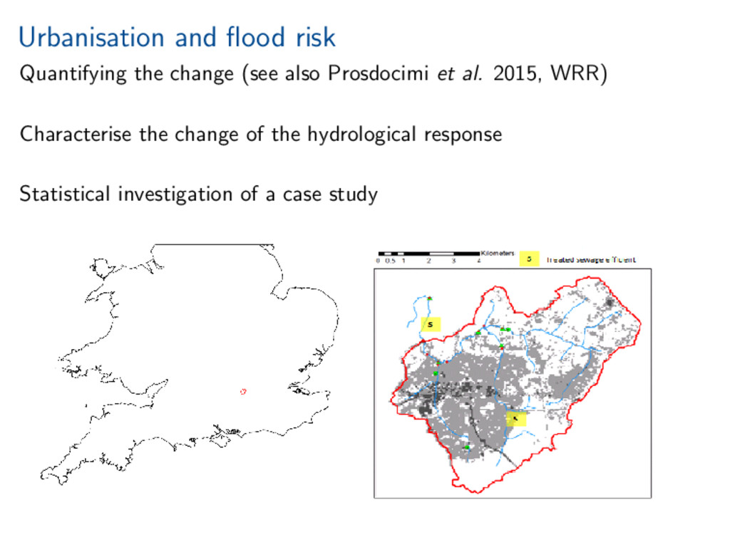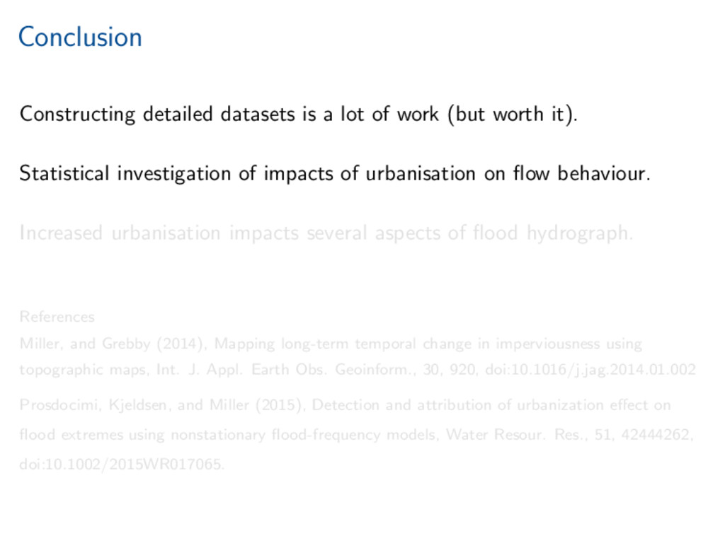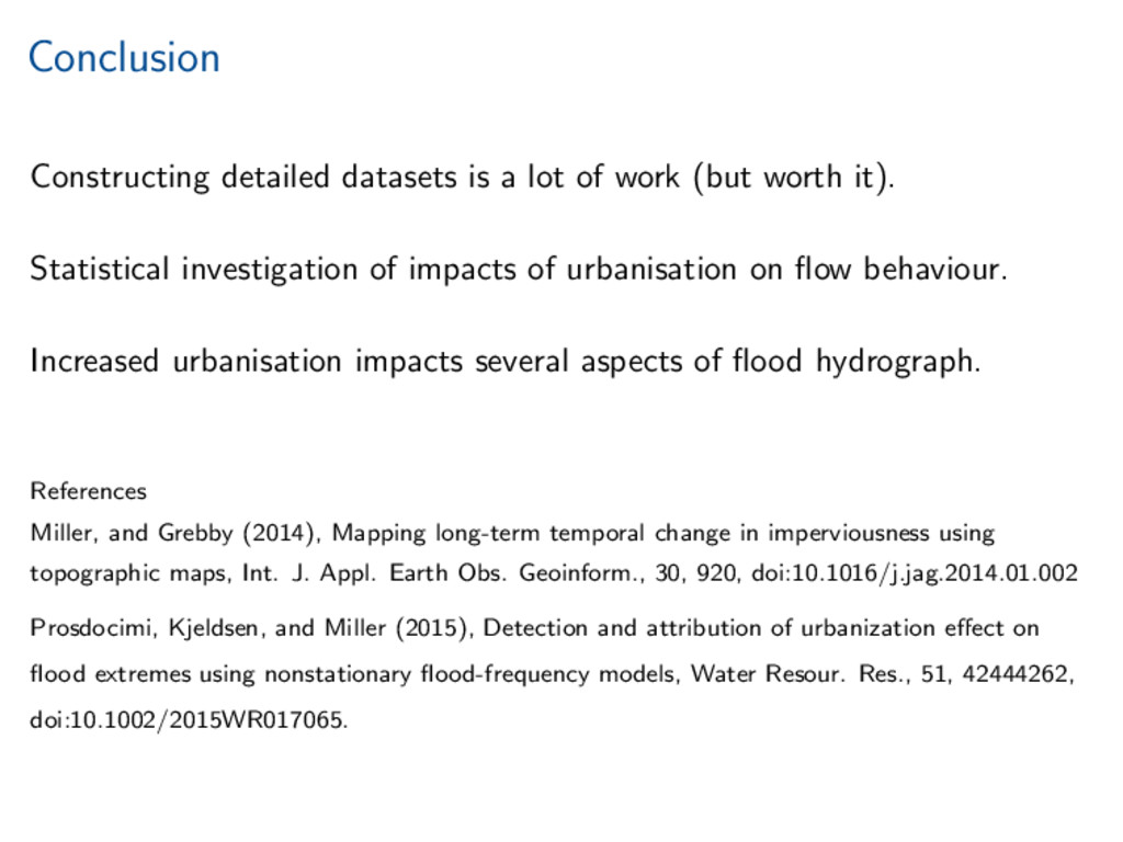 worth it). Statistical investigation of impacts of urbanisation on flow behaviour. Increased urbanisation impacts several aspects of flood hydrograph. References Miller, and Grebby (2014), Mapping long-term temporal change in imperviousness using topographic maps, Int. J. Appl. Earth Obs. Geoinform., 30, 920, doi:10.1016/j.jag.2014.01.002 Prosdocimi, Kjeldsen, and Miller (2015), Detection and attribution of urbanization effect on flood extremes using nonstationary flood-frequency models, Water Resour. Res., 51, 42444262, doi:10.1002/2015WR017065.