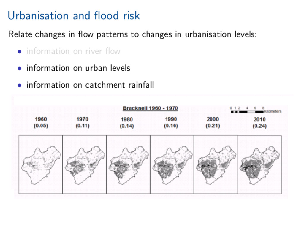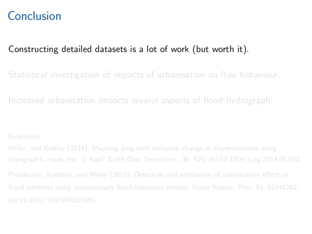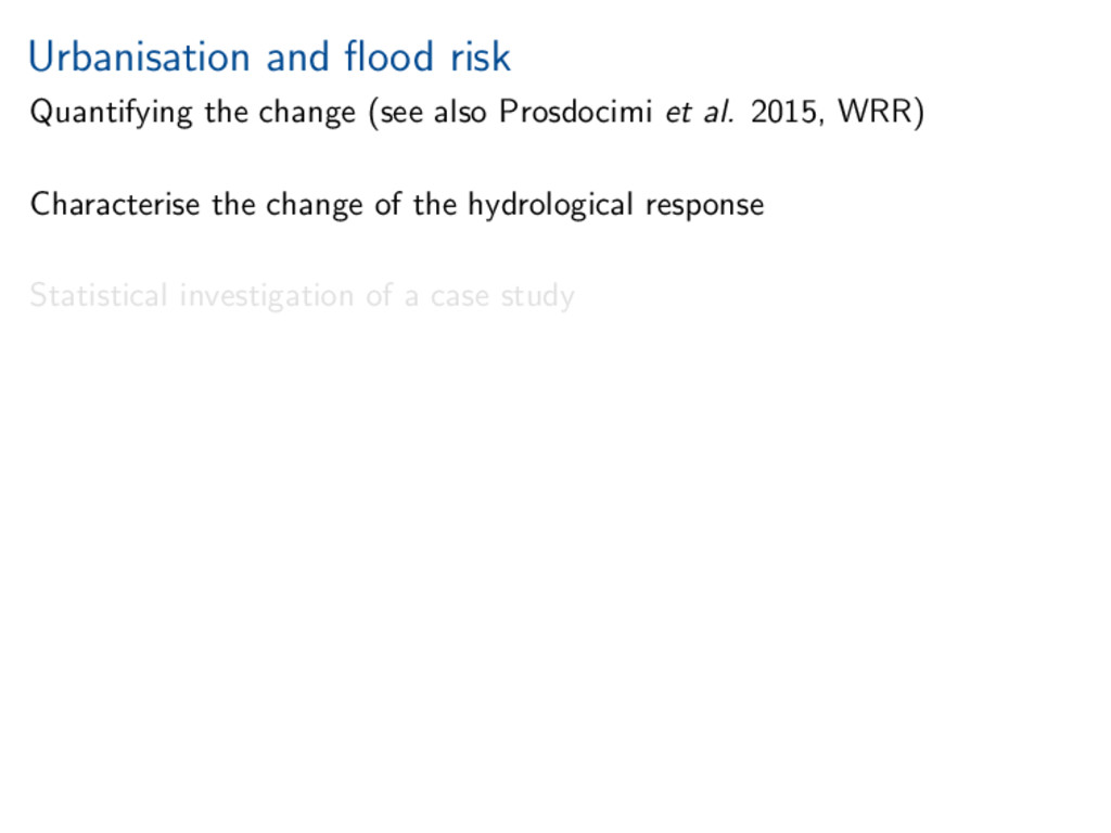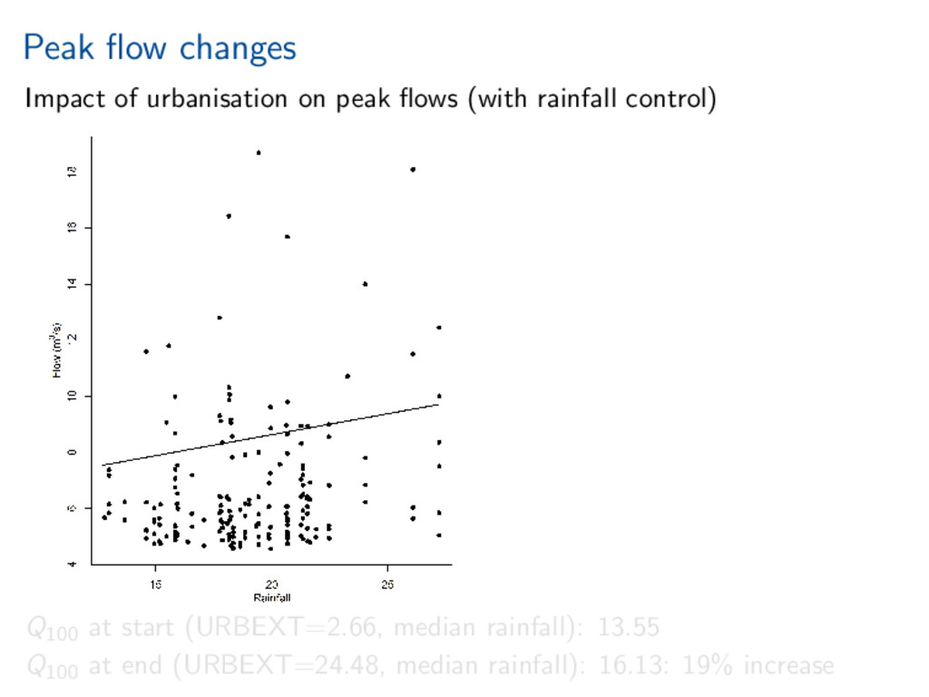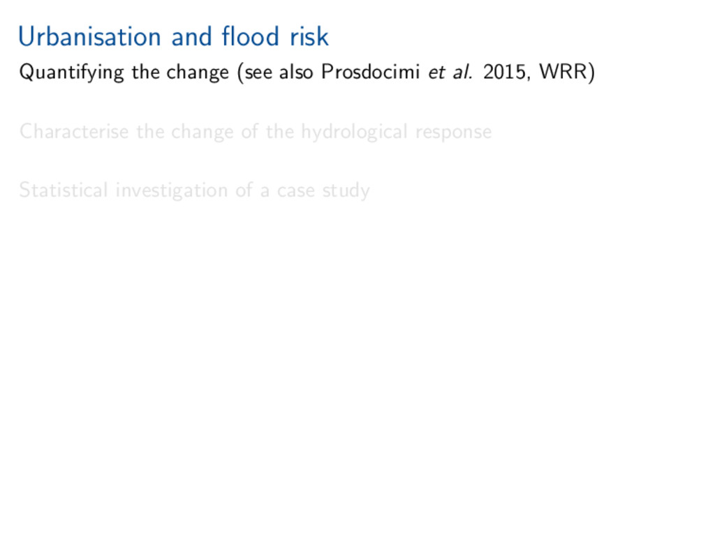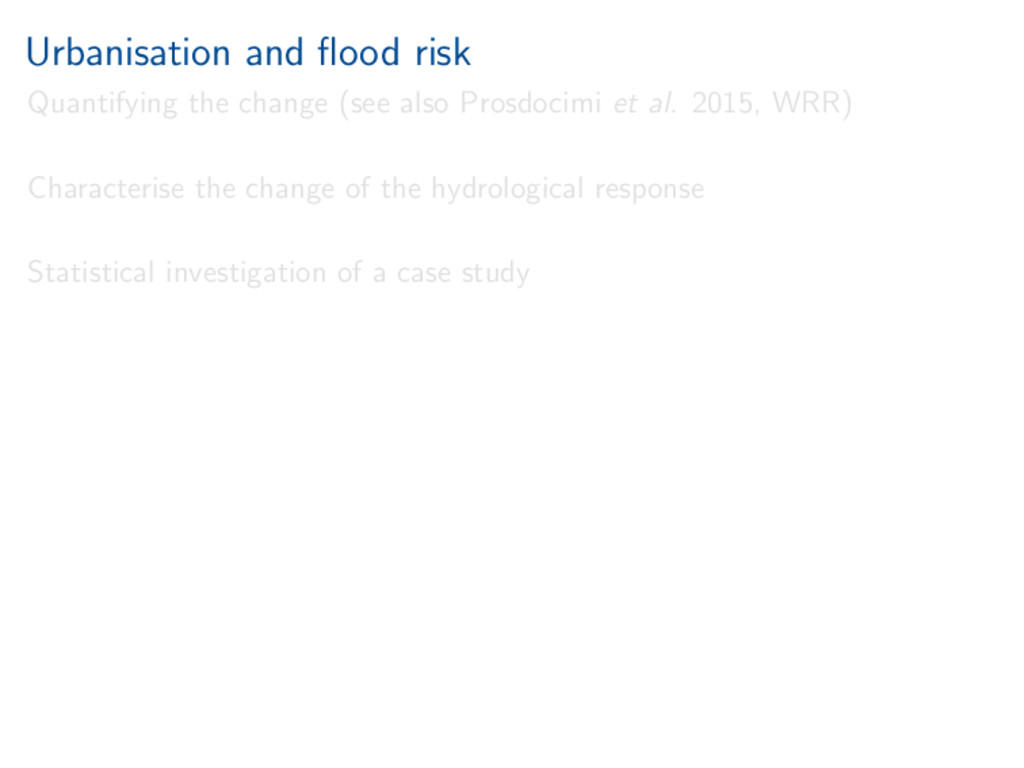worth it). Statistical investigation of impacts of urbanisation on flow behaviour. Increased urbanisation impacts several aspects of flood hydrograph. References Miller, and Grebby (2014), Mapping long-term temporal change in imperviousness using topographic maps, Int. J. Appl. Earth Obs. Geoinform., 30, 920, doi:10.1016/j.jag.2014.01.002 Prosdocimi, Kjeldsen, and Miller (2015), Detection and attribution of urbanization effect on flood extremes using nonstationary flood-frequency models, Water Resour. Res., 51, 42444262, doi:10.1002/2015WR017065.