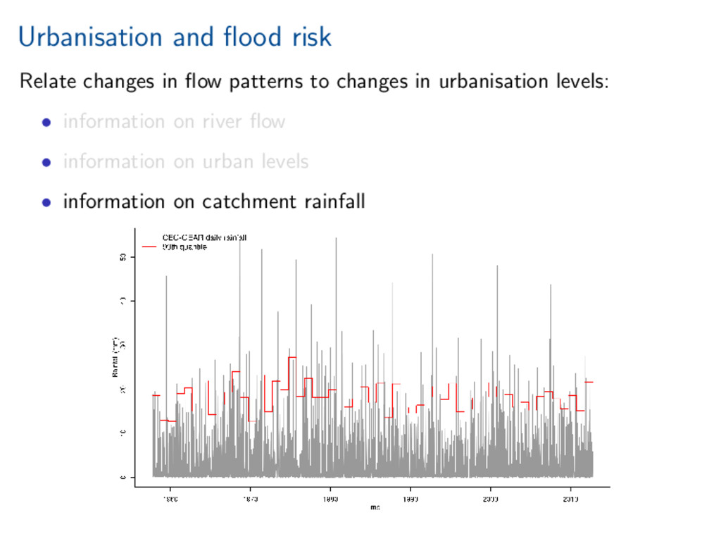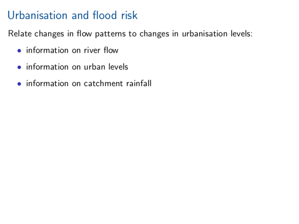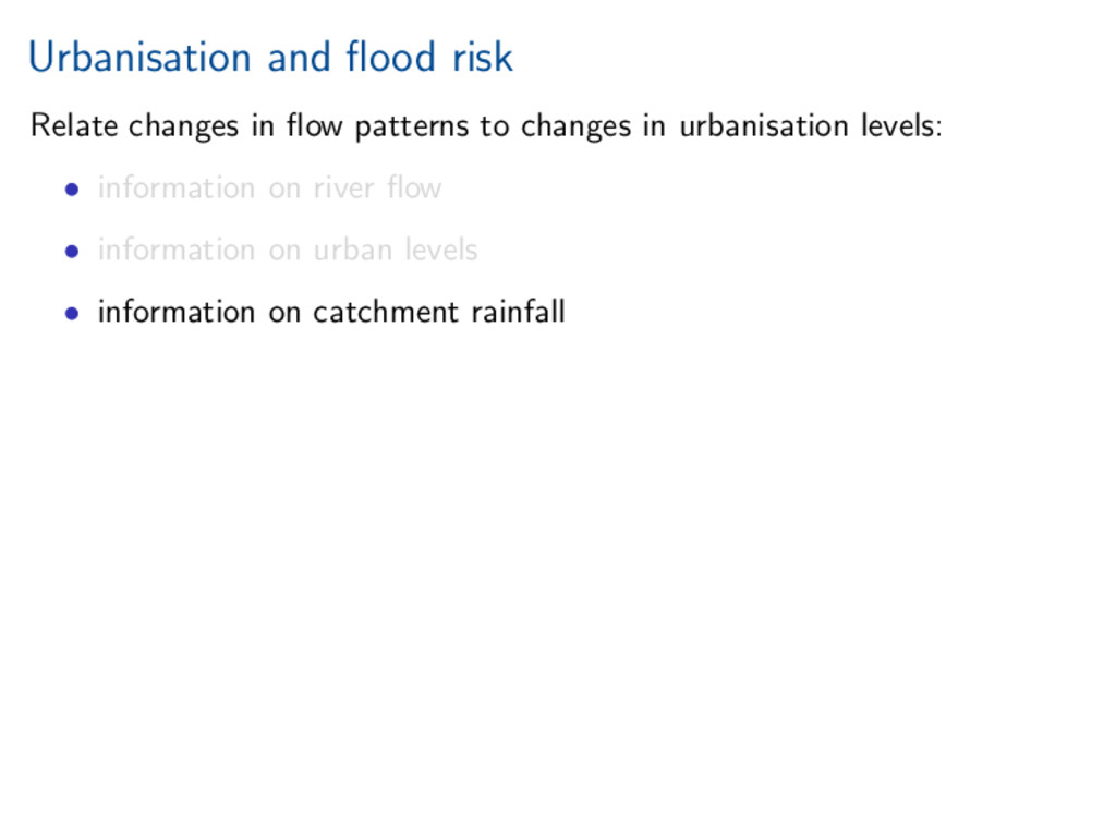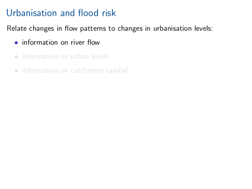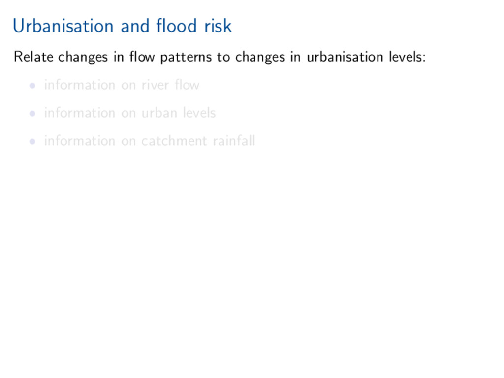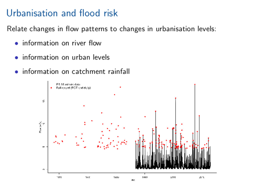 worth it). Statistical investigation of impacts of urbanisation on flow behaviour. Increased urbanisation impacts several aspects of flood hydrograph. References Miller, and Grebby (2014), Mapping long-term temporal change in imperviousness using topographic maps, Int. J. Appl. Earth Obs. Geoinform., 30, 920, doi:10.1016/j.jag.2014.01.002 Prosdocimi, Kjeldsen, and Miller (2015), Detection and attribution of urbanization effect on flood extremes using nonstationary flood-frequency models, Water Resour. Res., 51, 42444262, doi:10.1002/2015WR017065.