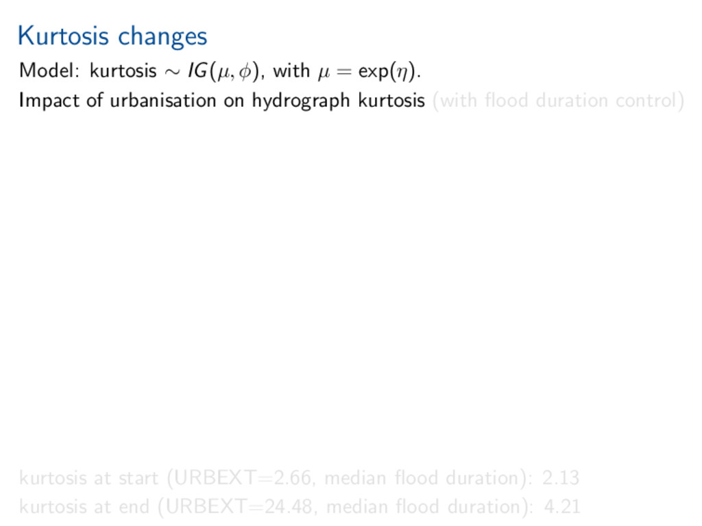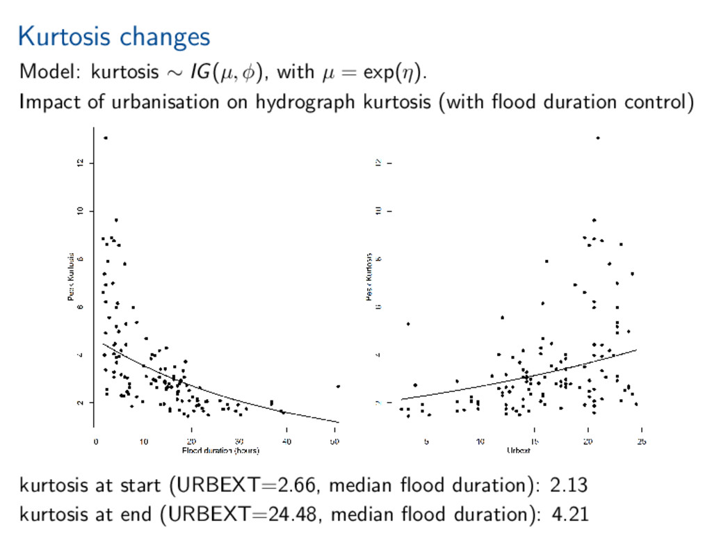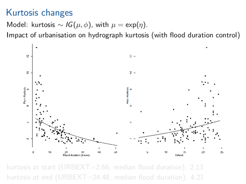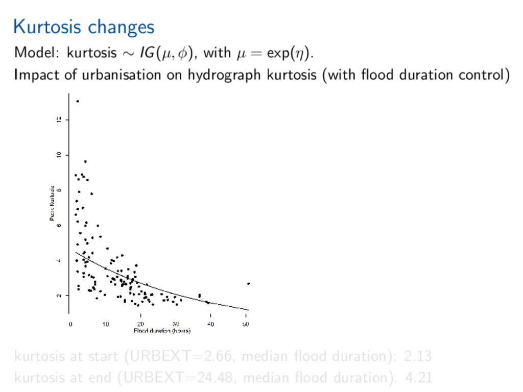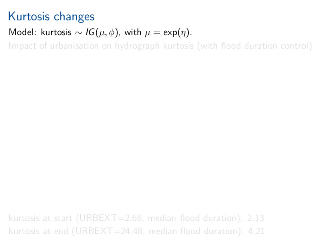 exp(η). Impact of urbanisation on hydrograph kurtosis (with flood duration control) kurtosis at start (URBEXT=2.66, median flood duration): 2.13 kurtosis at end (URBEXT=24.48, median flood duration): 4.21