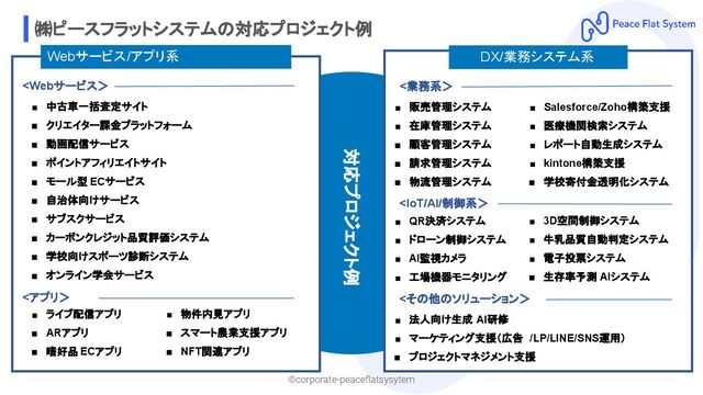 ▪ ポイントアフィリエイトサイト ▪ モール型 ECサービス ▪ 自治体向けサービス ▪ サブスクサービス ▪ カーボンクレジット品質評価システム ▪ 学校向けスポーツ診断システム ▪ オンライン学会サービス <Webサービス> ▪ ライブ配信アプリ ▪ ARアプリ ▪ 嗜好品 ECアプリ <アプリ> DX/業務システム系 ▪ 販売管理システム ▪ 在庫管理システム ▪ 顧客管理システム ▪ 請求管理システム ▪ 物流管理システム <業務系> ▪ Salesforce/Zoho構築支援 ▪ 医療機関検索システム ▪ レポート自動生成システム ▪ kintone構築支援 ▪ 学校寄付金透明化システム ▪ 物件内見アプリ ▪ スマート農業支援アプリ ▪ NFT関連アプリ ▪ QR決済システム ▪ ドローン制御システム ▪ AI監視カメラ ▪ 工場機器モニタリング <IoT/AI/制御系> ▪ 3D空間制御システム ▪ 牛乳品質自動判定システム ▪ 電子投票システム ▪ 生存率予測 AIシステム <その他のソリューション> ▪ 法人向け生成 AI研修 ▪ マーケティング支援(広告 /LP/LINE/SNS運用) ▪ プロジェクトマネジメント支援