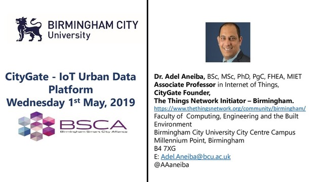 Dr. Adel Aneiba, BSc, MSc, PhD, PgC, FHEA, MIET Associate Professor in Internet of Things, CityGate Founder, The Things Network Initiator – Birmingham. https://www.thethingsnetwork.org/community/birmingham/ Faculty of Computing, Engineering and the Built Environment Birmingham City University City Centre Campus Millennium Point, Birmingham B4 7XG E: