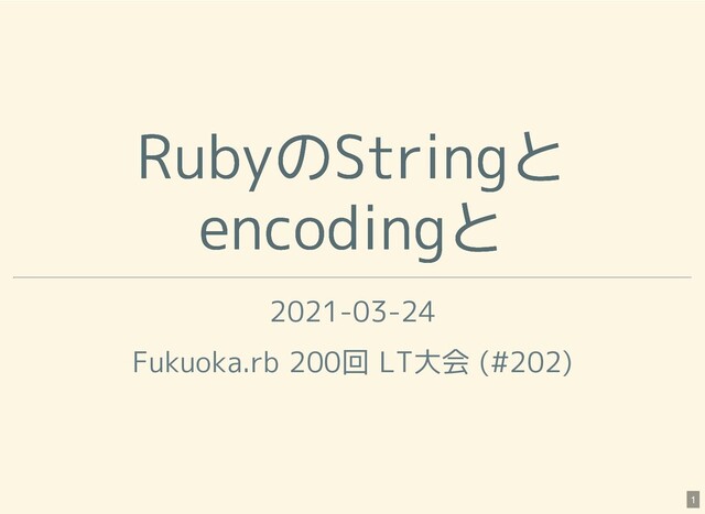 RubyのStringと RubyのStringと encodingと encodingと 2021-03-24 Fukuoka.rb 200回 LT大会 (#202) 1